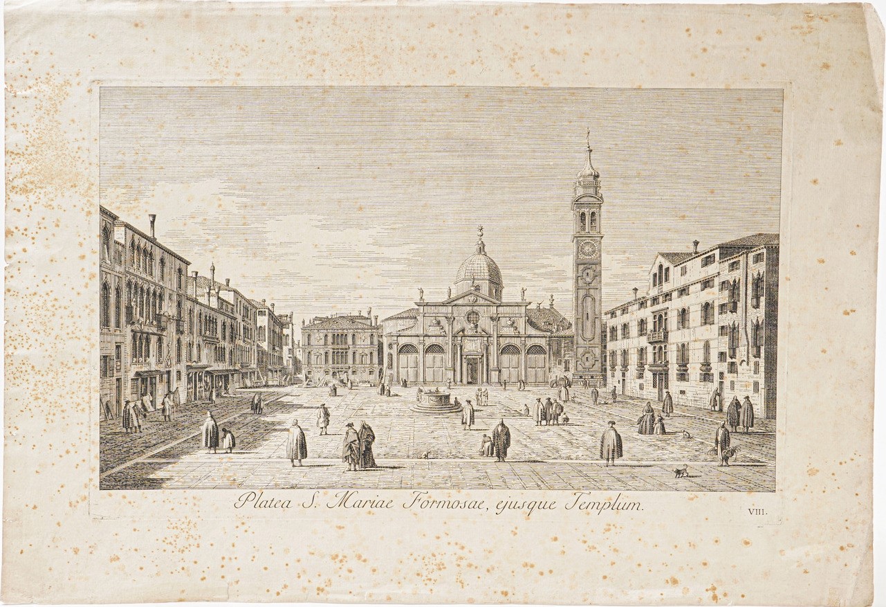 Tre vedute tratte dalla celebre serie incisa dal Visentini, su invenzione del Canaletto: I° Prospectus ad aedibus Corneliorum ad S.Vitalem. II° Platea S. Marie Formosae eiesque templum. III° Dal Palazzo Pesaro a S. Geremia. Alcune fioriture e piccoli strappetti marginali.