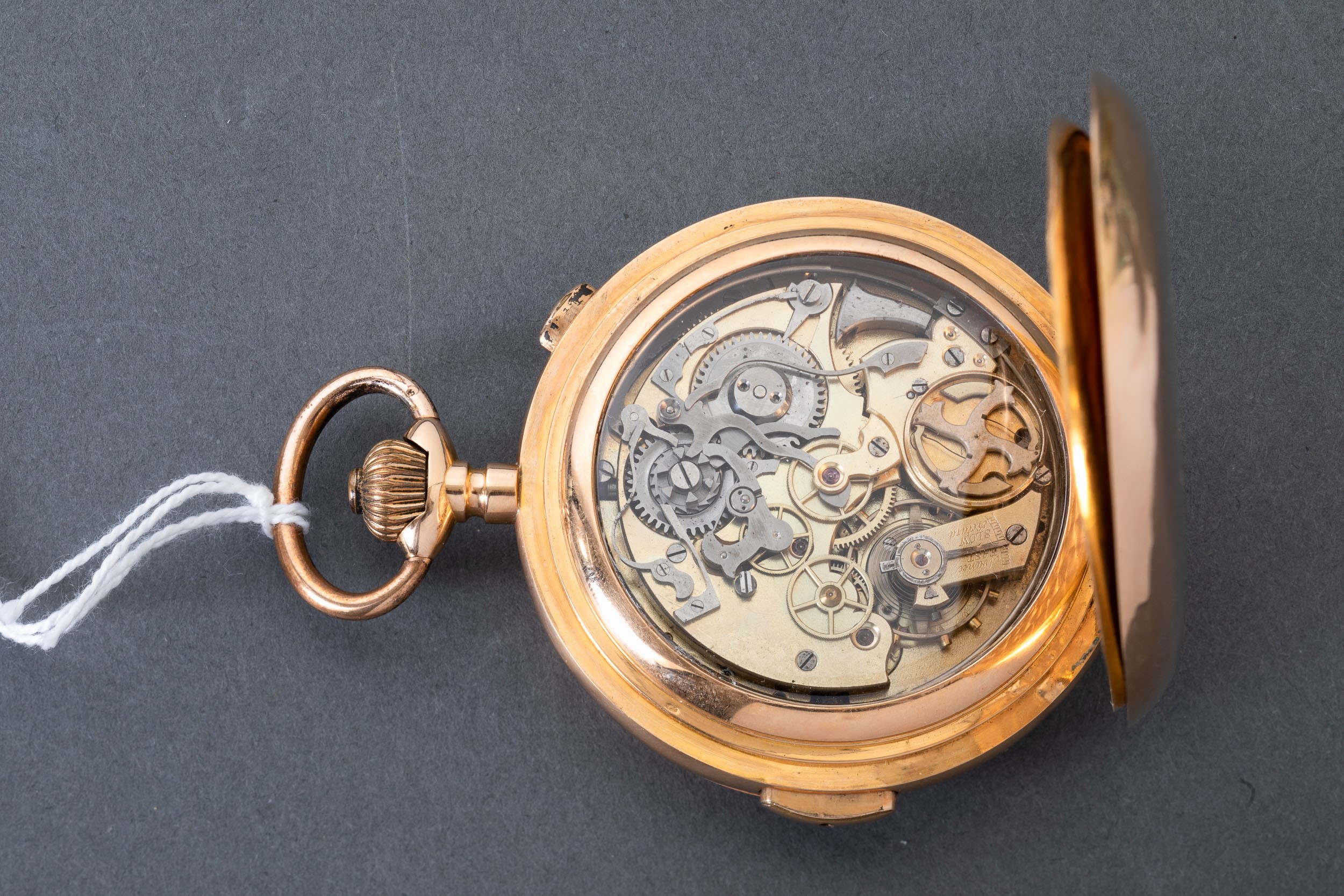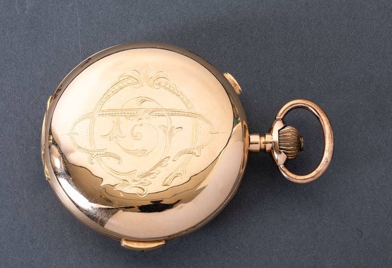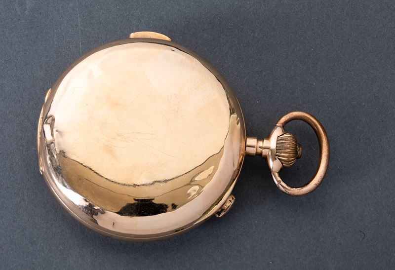 Crono e suoneria quarti cassa in oro 18 kt, quadrante in smalto bianco, suoneria a pulsante, richiede revisione, scappamento ad ancora, 56 mm, gr 115, lievi segni di usura.