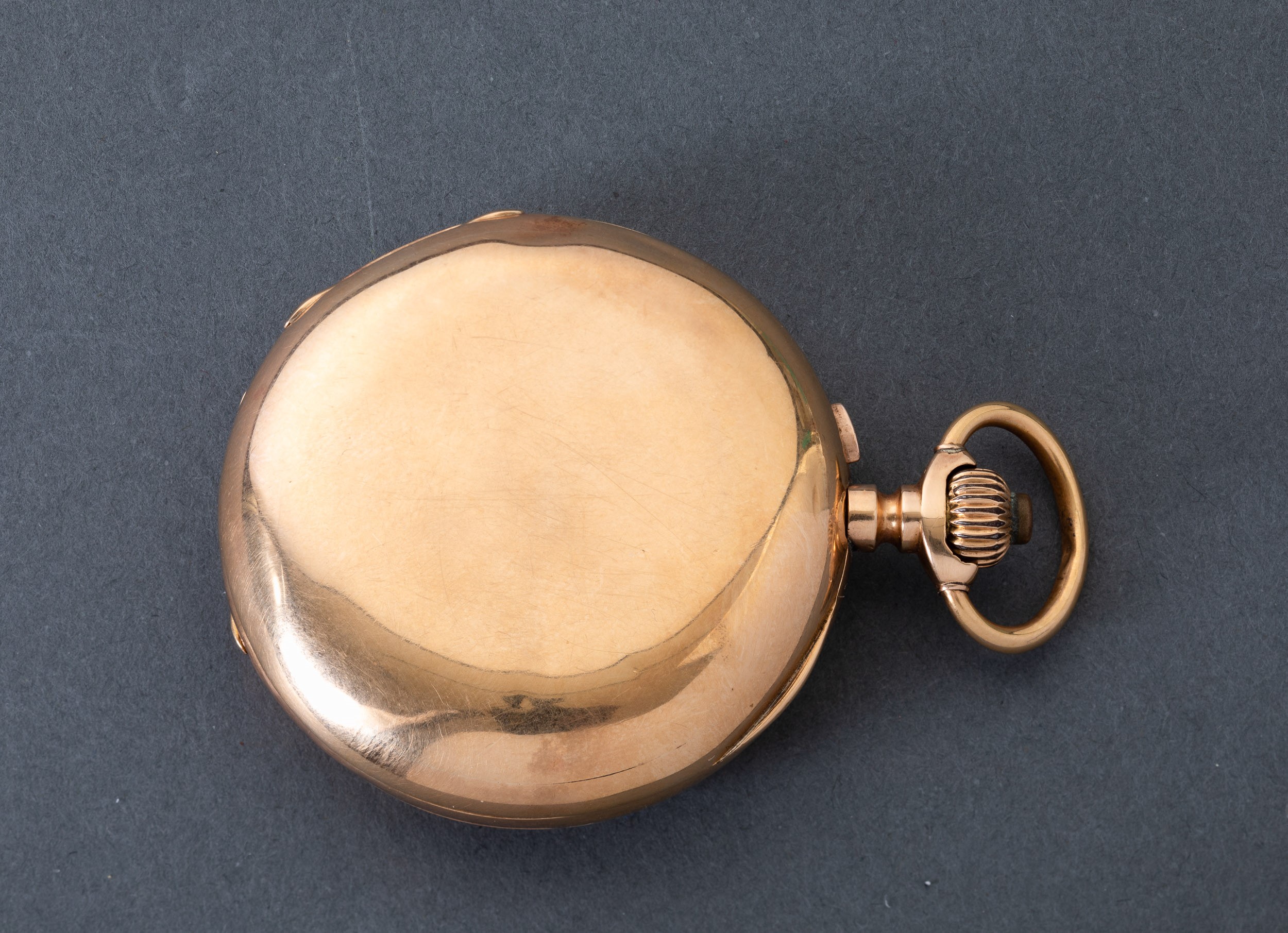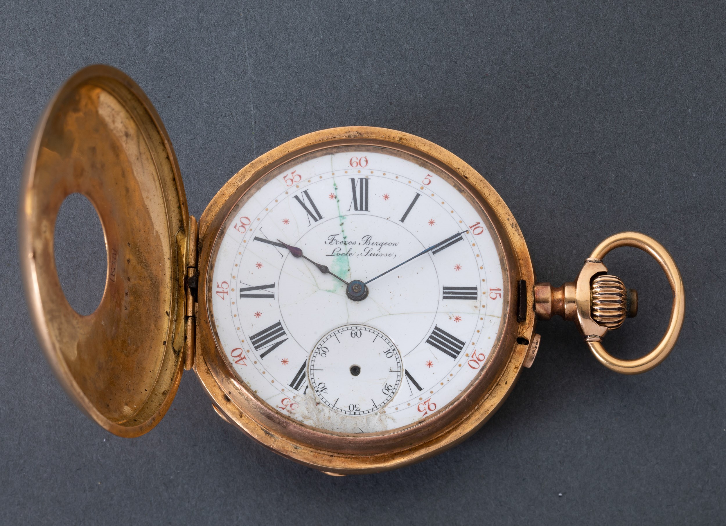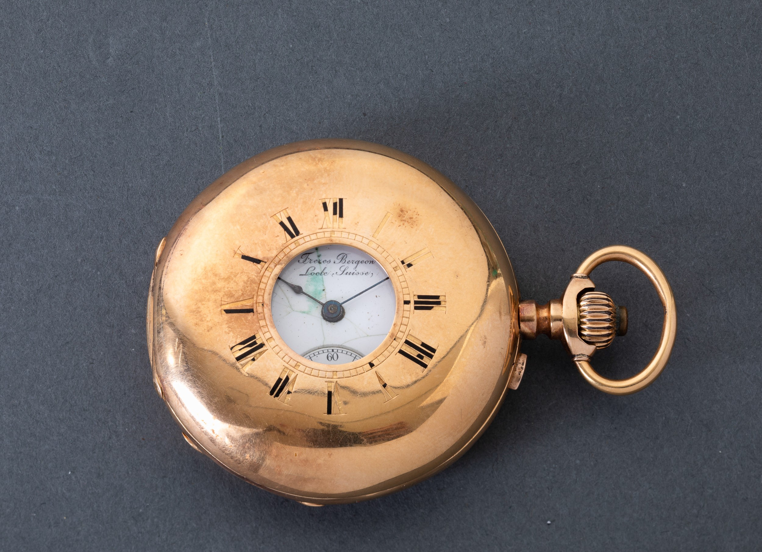orologio in oro 18 k, 1890 circa, firmato Freres Bergeon, cassa half hunter, occhio di bue , movimento a scappamento ad ancora, gr 101, mm 48