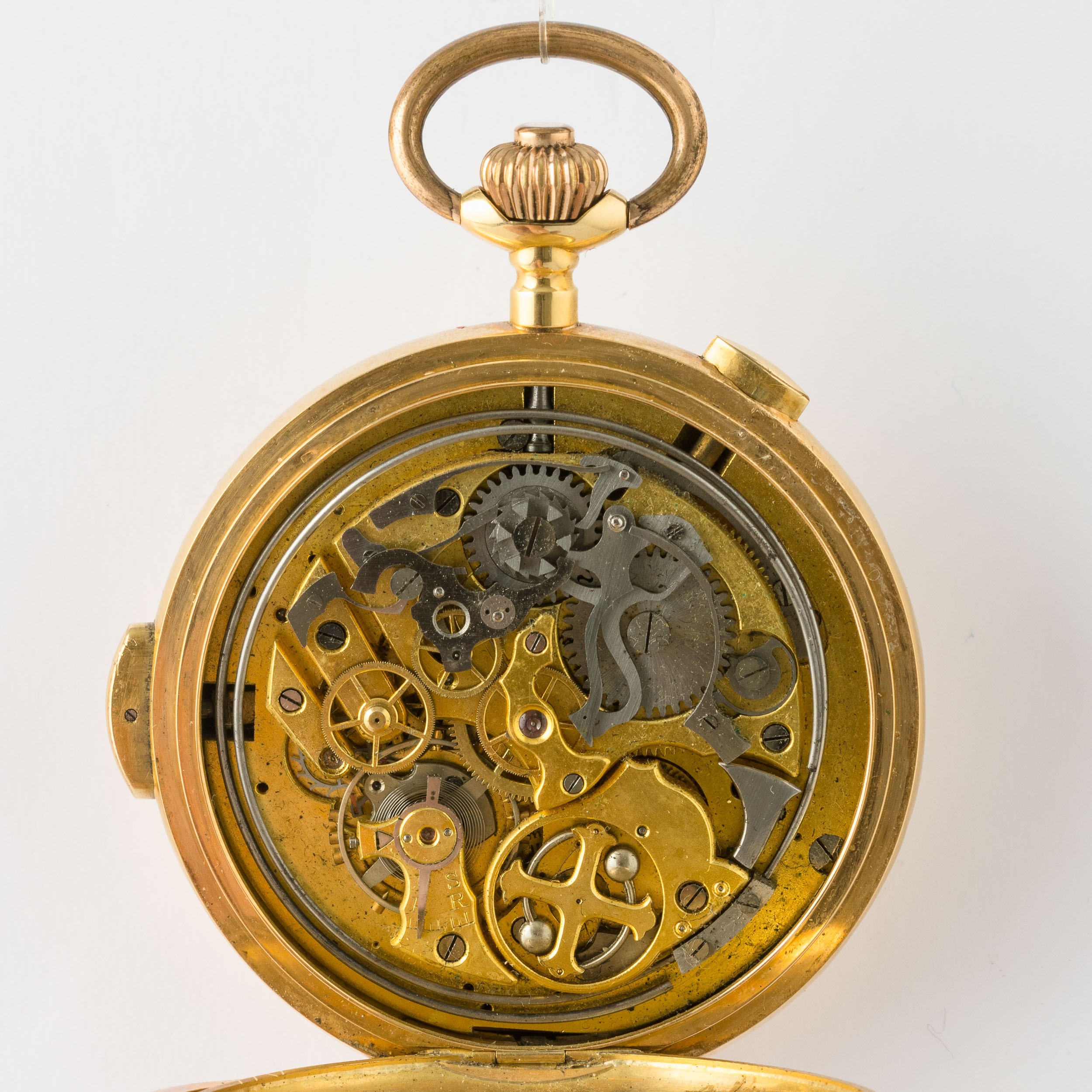Orologio da tasca con cronografo e suoneria quarti ( con attivazione a pulsanti ), cassa savonette in oro 18 kt, quadrante in smalto bianco con calendario, movimento scappamento ad ancora, suoneria su gong, mm 58, gr 120