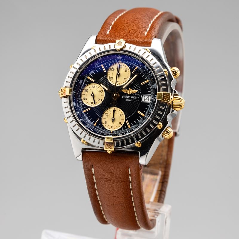 Breitling Chronomat in acciaio, quadrante nero con tre contatori champagne, indici a bastone applicati e datario, carica automatica, ref 13050.1, cinturino in pelle, 36,8 mm, 1995 circa