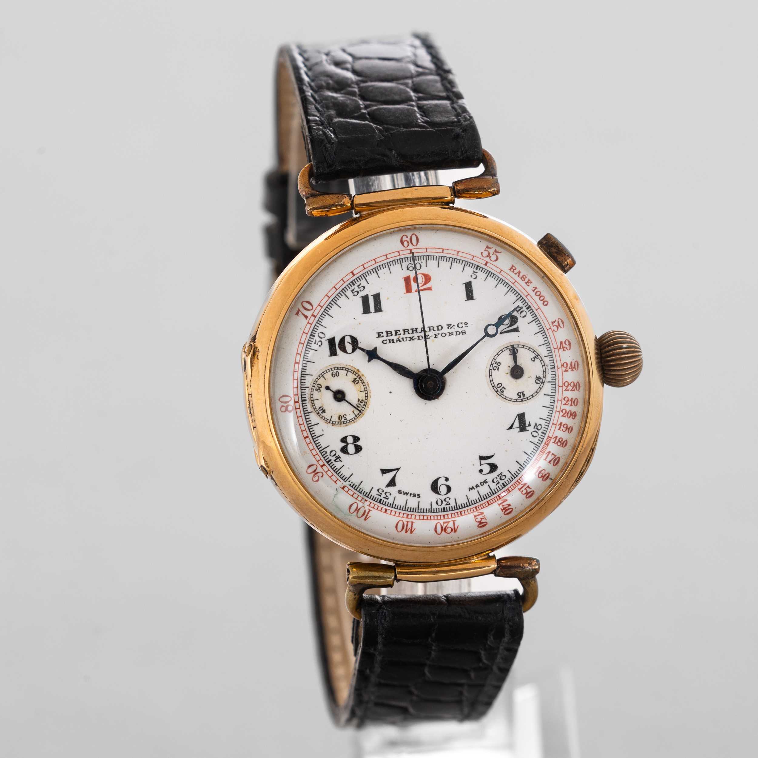 Eberhard, cronografo monopulsante a carica manuale, quadrante in smalto binco con numeri e sfere Breguet, cassa in oro giallo 18k con anse snodate, 38 mm, circa 1920-30