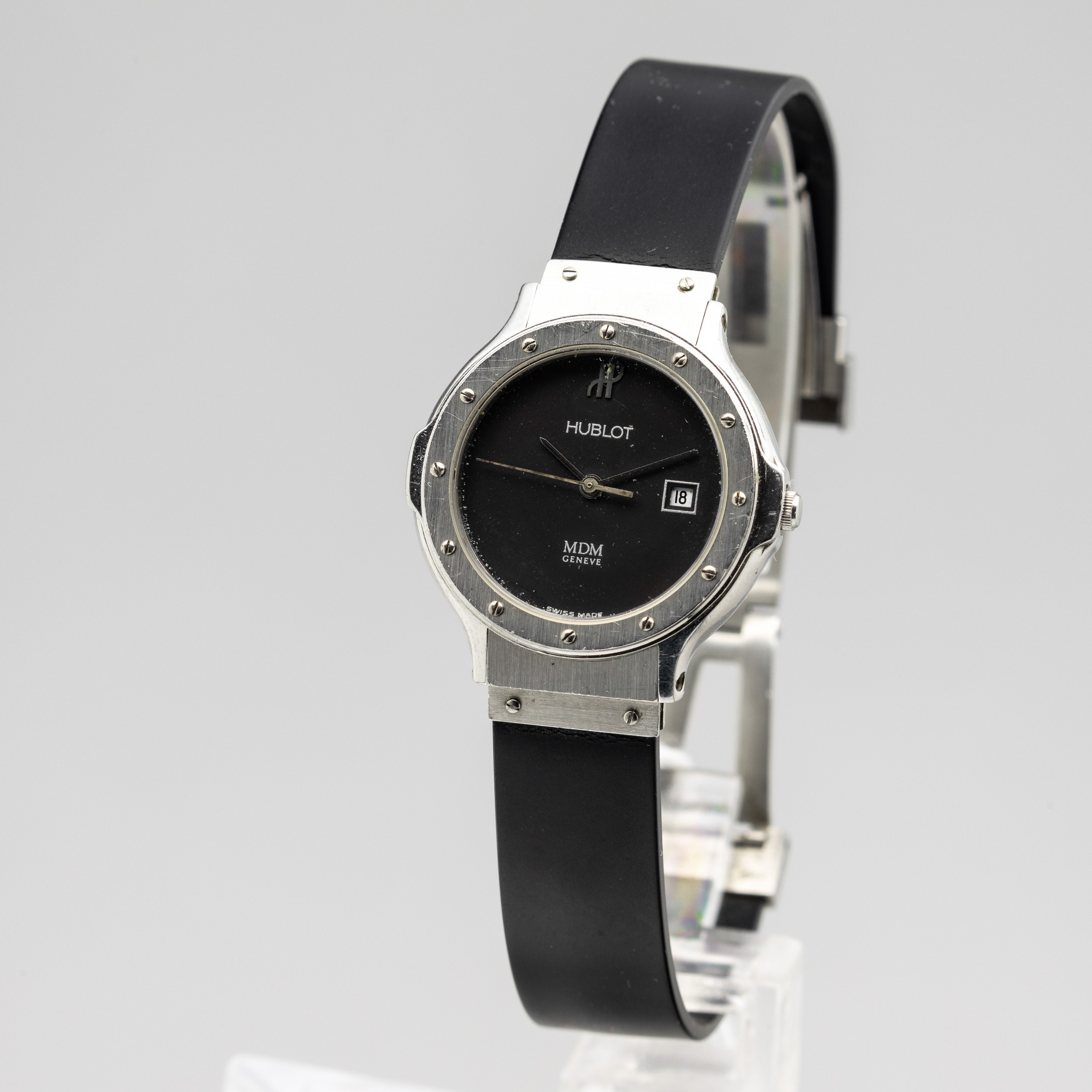 Hublot MDM Lady in acciaio movimento al quarzo con datario, quadrante nero, cinturino in gomma con chiusura deployante, 28 mm, circa 1990