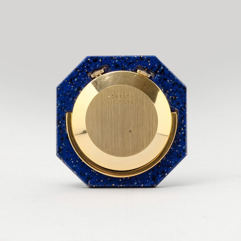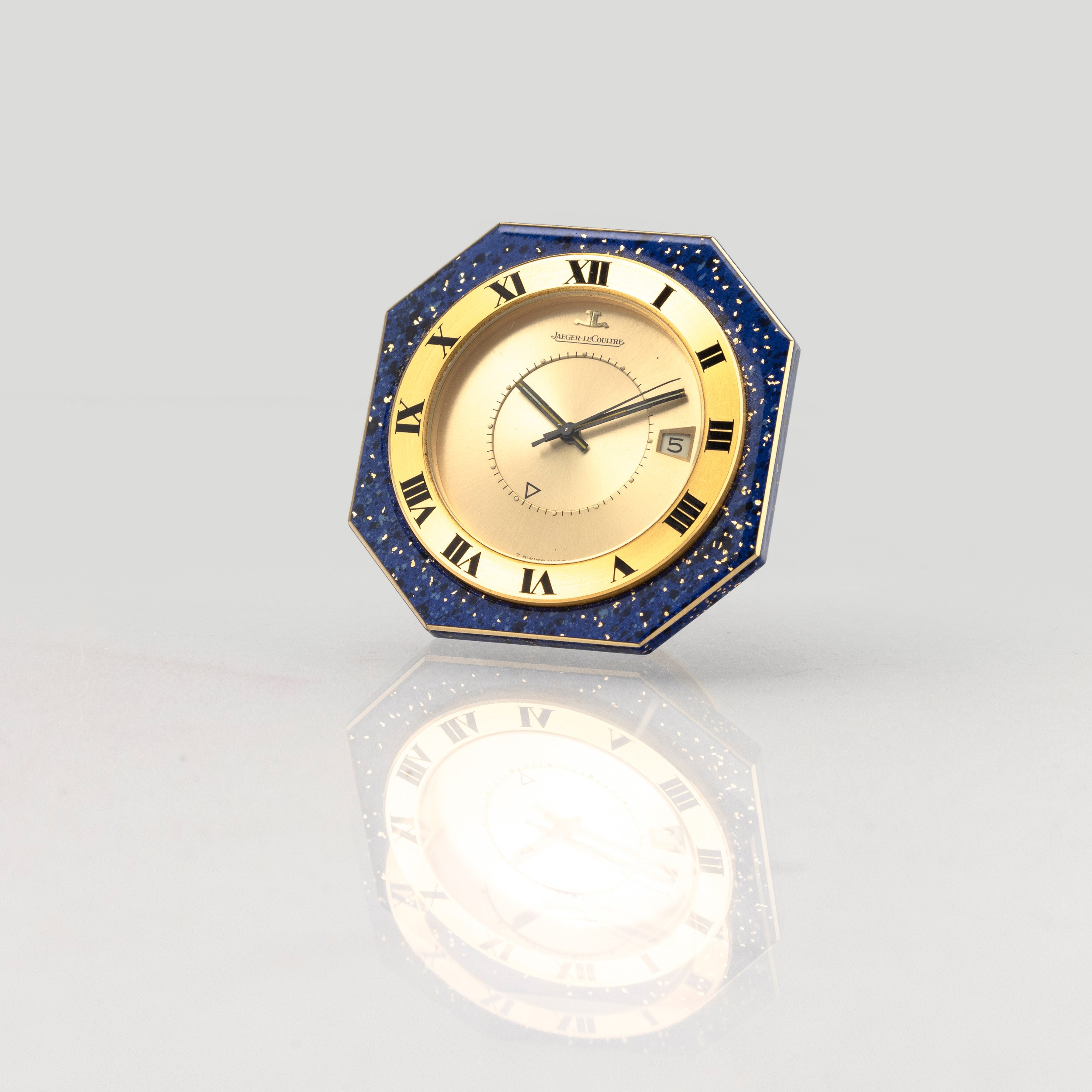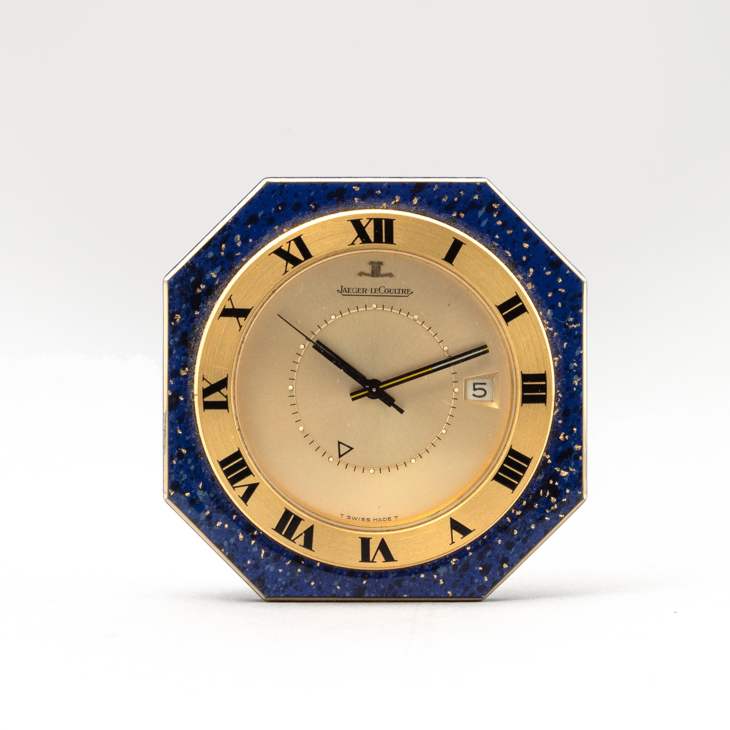 Jaeger Le Coultre sveglia da viaggio in lapis, quadrante Argentè con datario e numeri romani, movimento al quarzo, 38 mm, 1970-1980 circa
