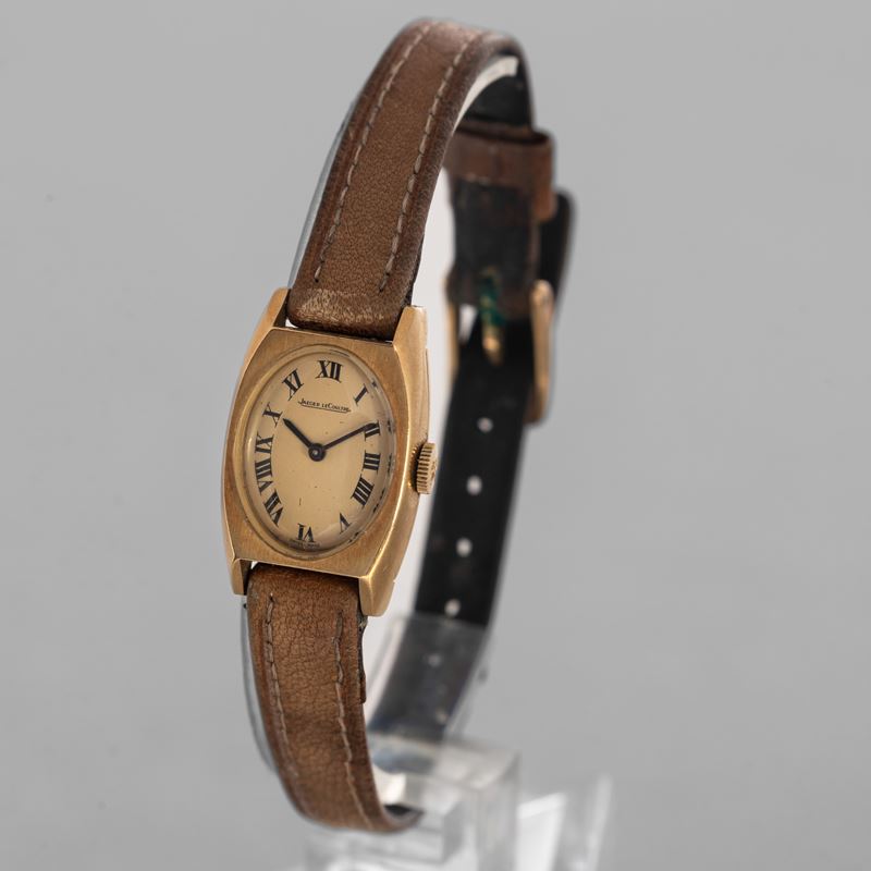 Jaeger Le Coultre Lady tonneau in oro 18k, quadrante champagne con numeri romani, carica manuale, cinturino in pelle, mm 20x17,5, 1960 circa