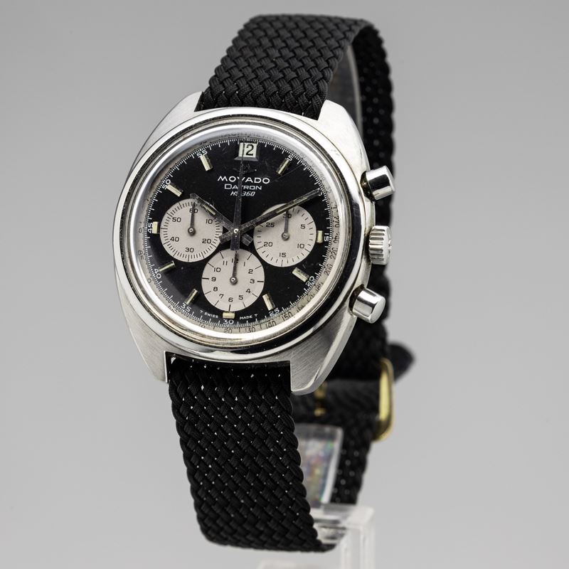 Movado Datron cronografo tre contatori con tasti a pompa, quadrante nero tre contatori, indici applicati e datario alle 12, carica manuale, 36,6 mm, 1970 circa.