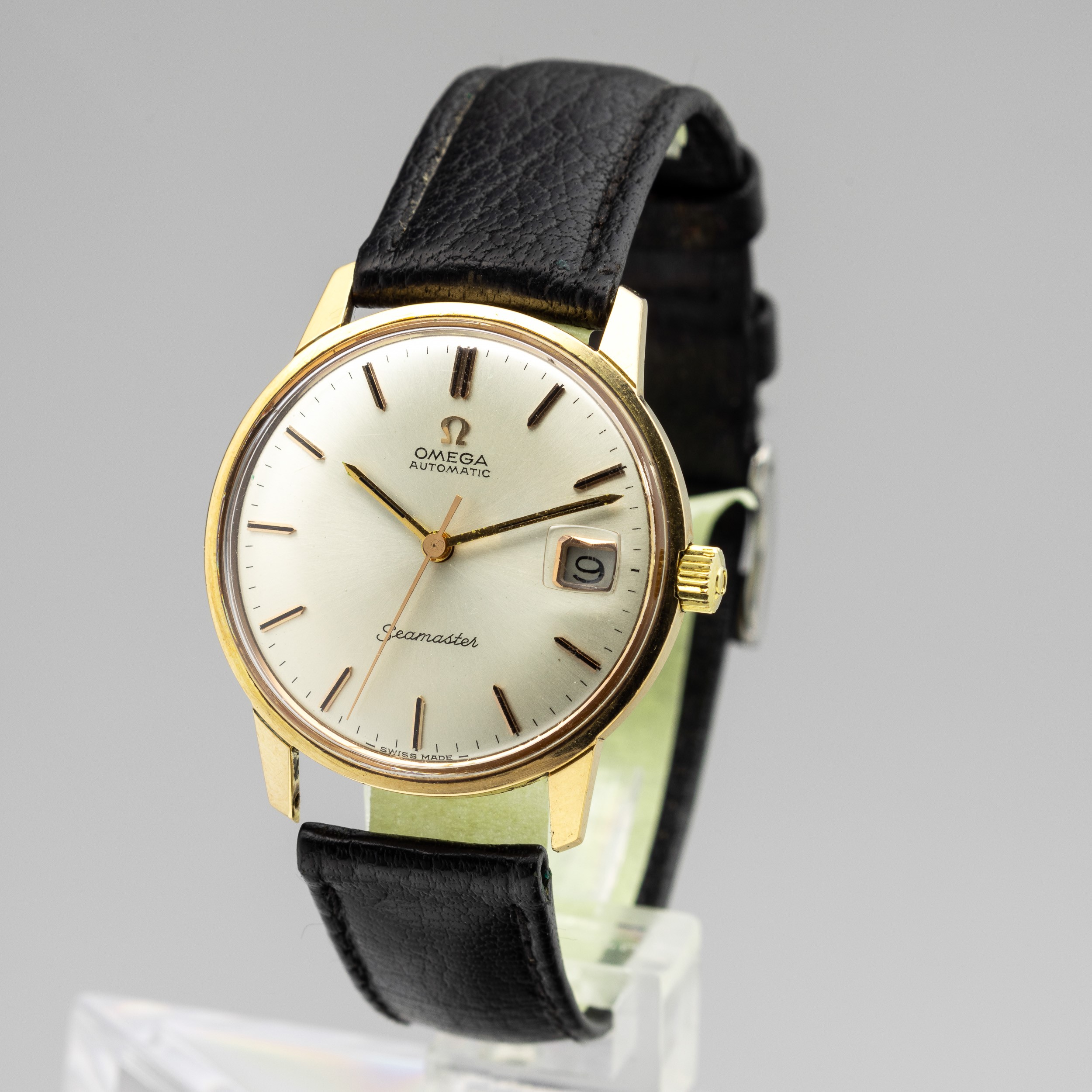 Omega Seamaster in oro giallo 18k, quadrante Argentè con datario, indici a bastone, carica automatica, 33 mm, 1970 circa