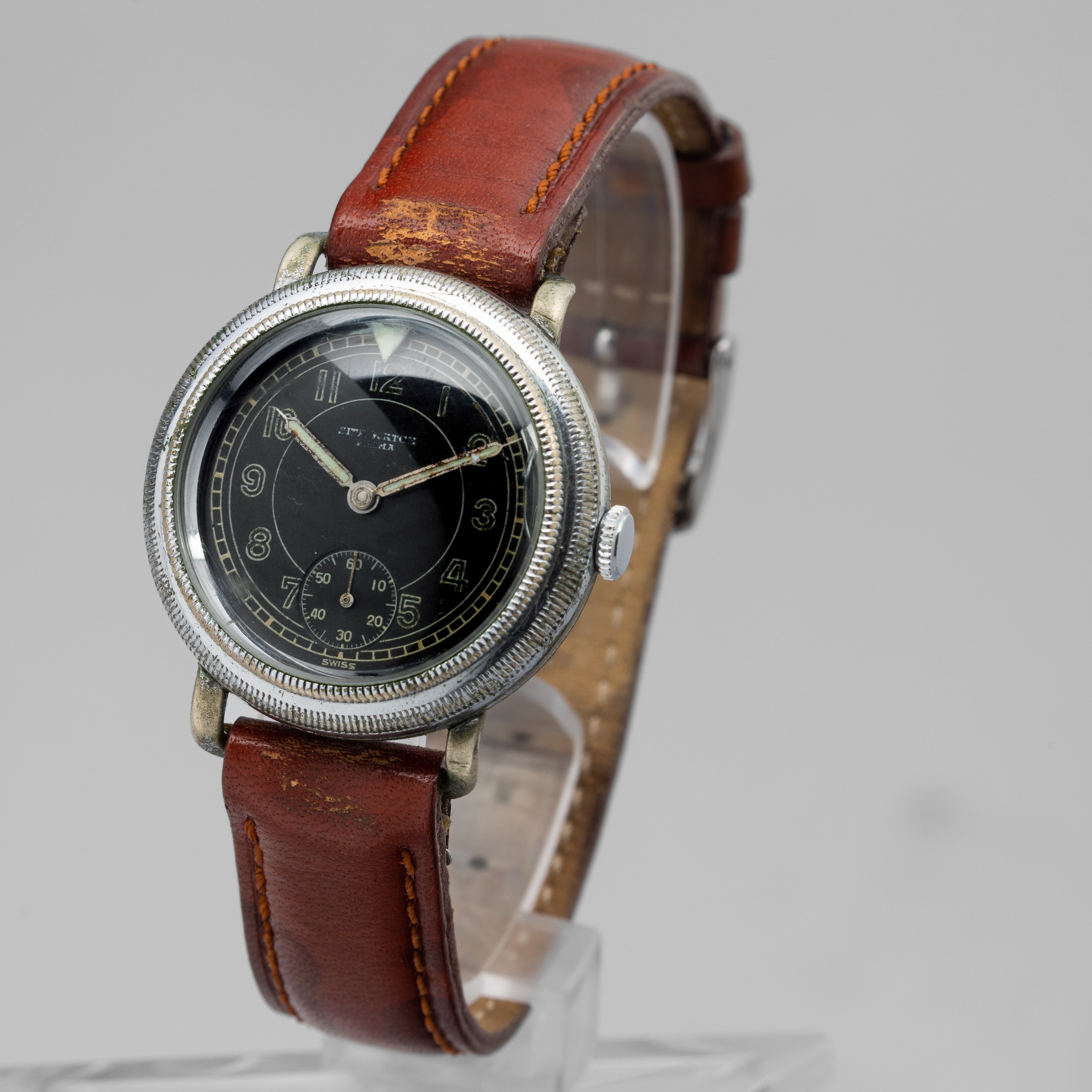 Sita Watch della seconda guerra mondiale, quadrante nero con numeri al radio, secondi ai sei e ghiera interna girevole, carica manuale, 34,7 mm, 1939 - 1945