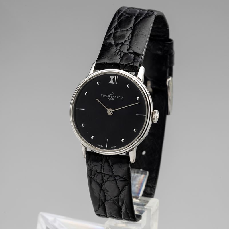 Ulysse Nardin in acciaio con quadrante nero e indici applicati, movimento al quarzo, cinturino in pelle, 22 mm, 1990 circa