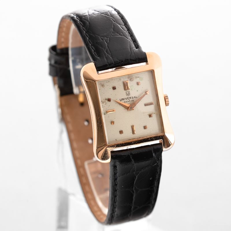 Universal Geneve in oro giallo 18k, quadrante Argenté Guilloché, indici applicati, cal U264, carica manuale, cinturino in pelle, 34x28 mm, 1950 circa