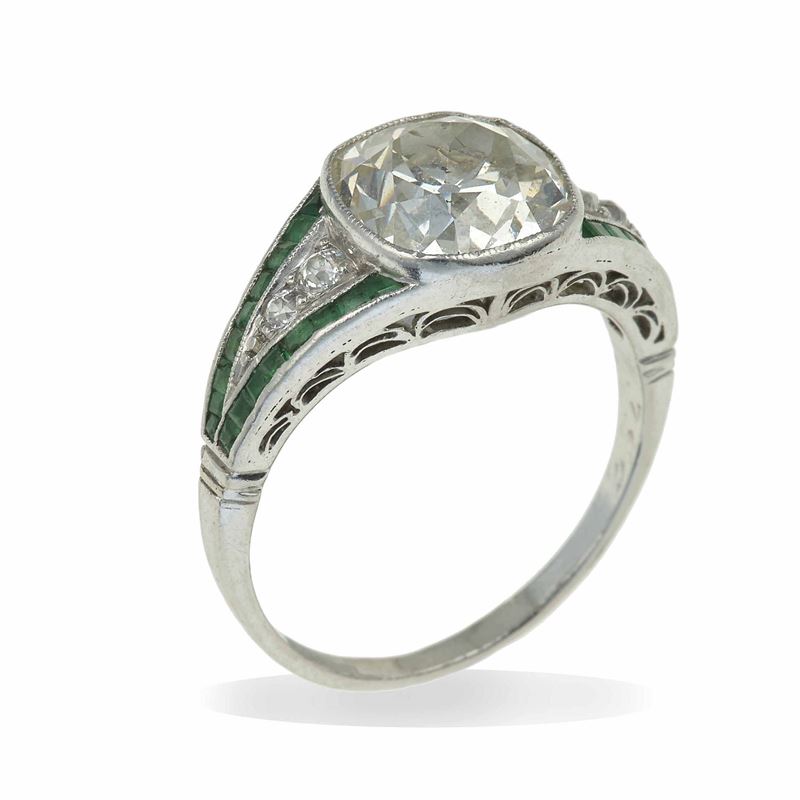 Cushion-cut diamond and emerald ring