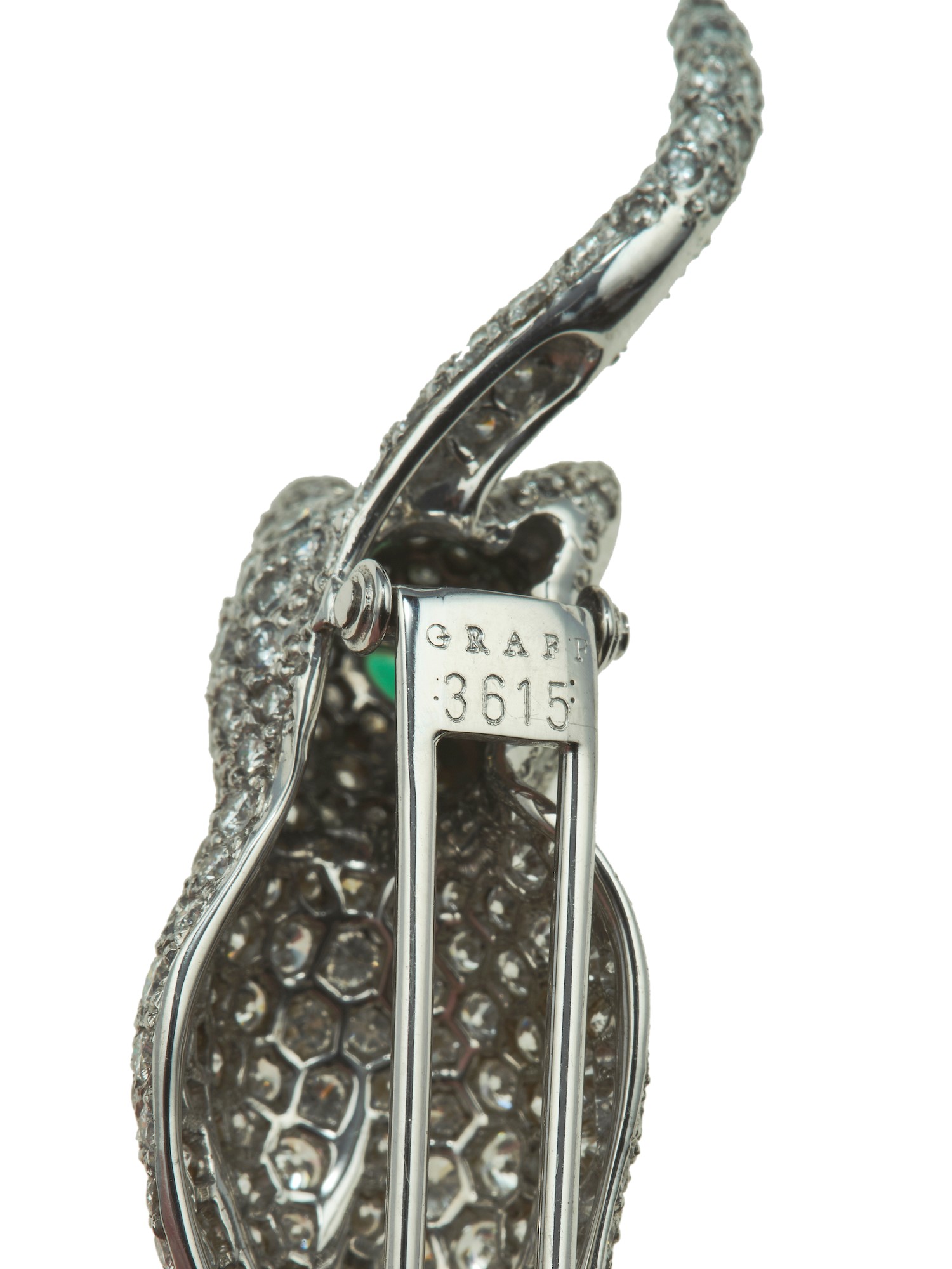 Diamond, emerald and platinum brooch. Signed and numbered Graff 3615