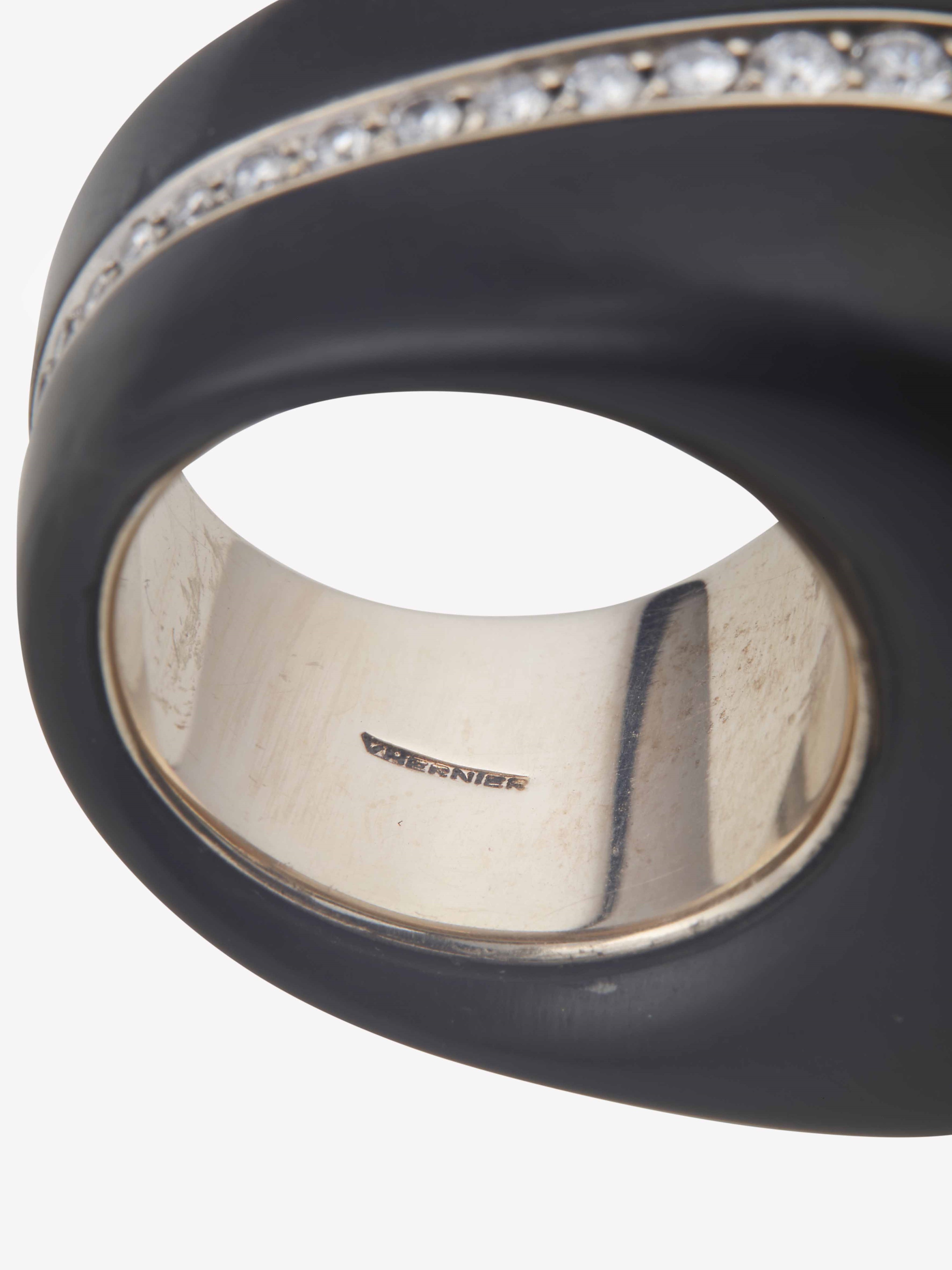 Jet, diamond and coral ring. Signed Vhernier