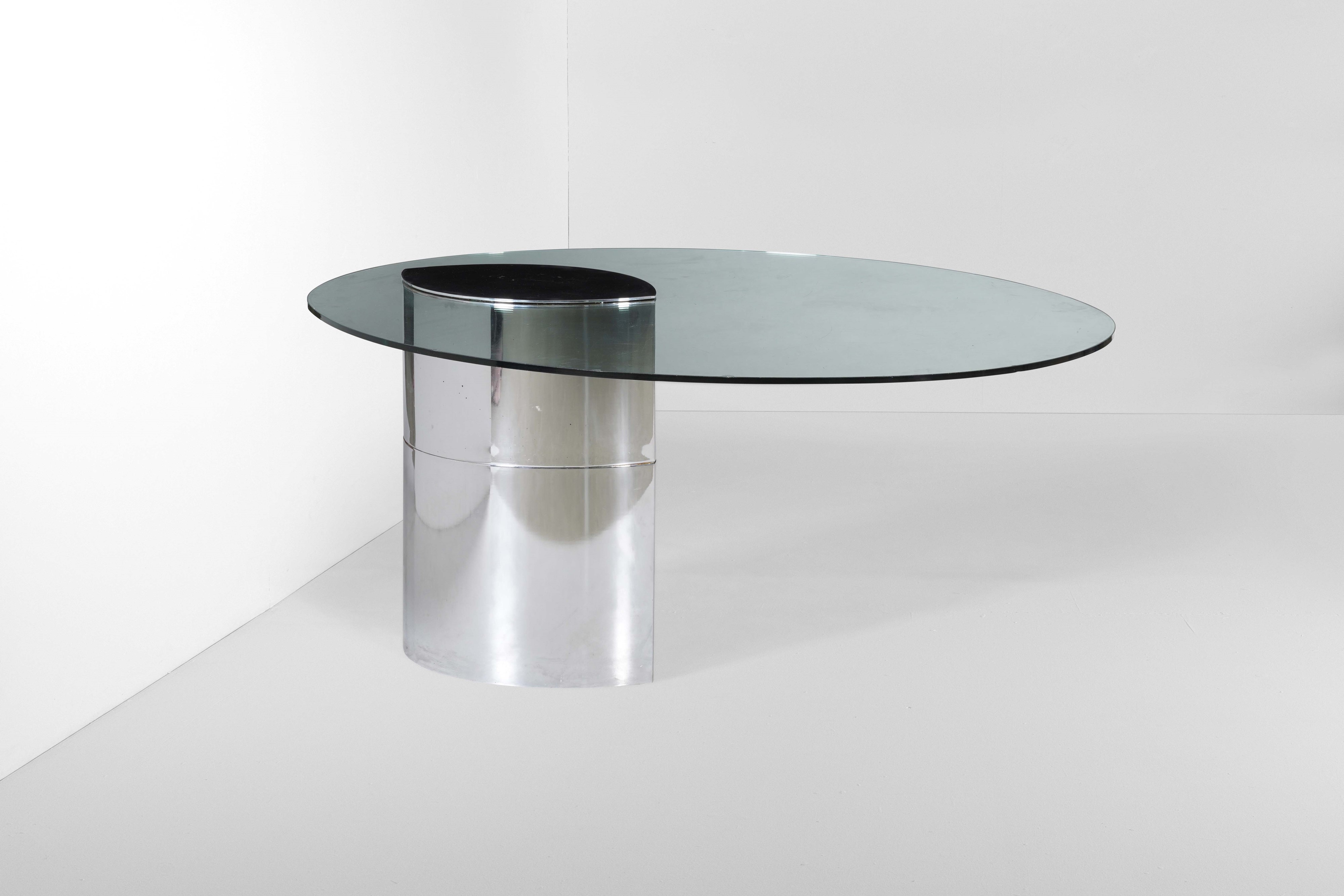 Struttura stampata in acciaio cromato e piano in cristallo molato.