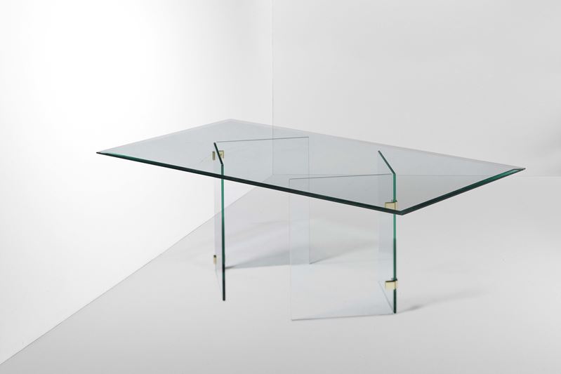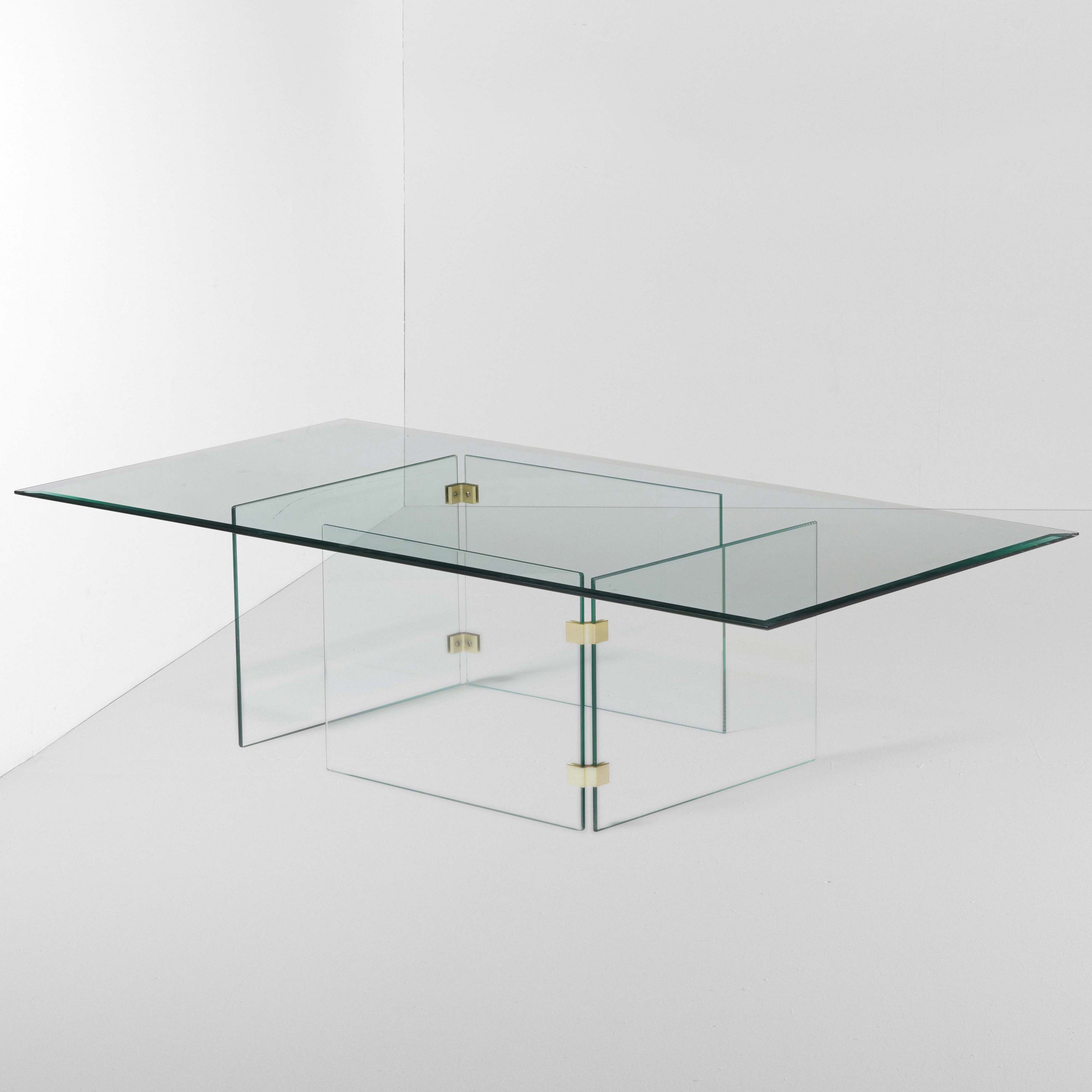 Sostegni e piano in cristallo molato. Particolari in ottone.