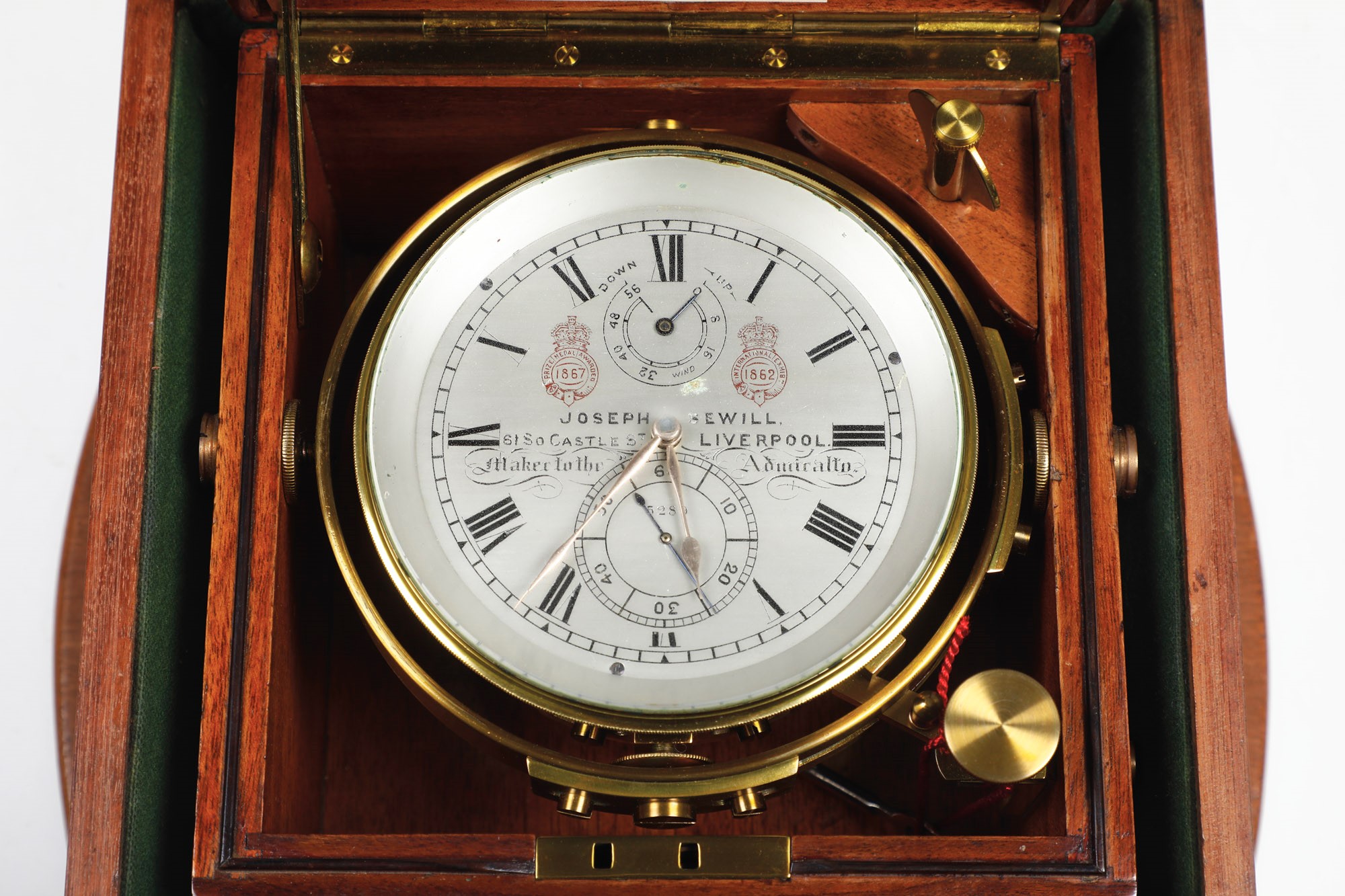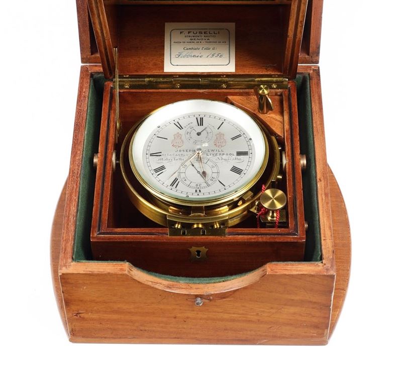 Cronometro da marina a due giorni di carica montato su sospensione cardanica in cassetta di mogano e cassetta di trasporto Joseph Sewill, Liverpool , numerato 5289. Inghilterra XIX secolo