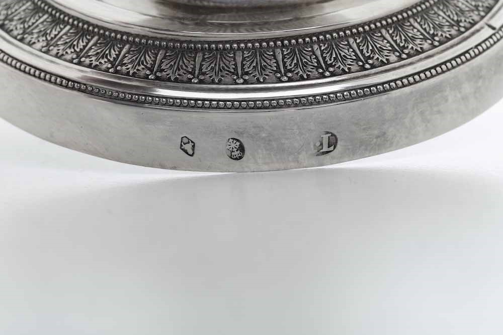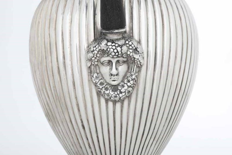 Esemplare modello di argenteria di gusto Carlo X con corpo costolato e decori a volute e fogliacei. Elegante monogramma inciso entro scudo
