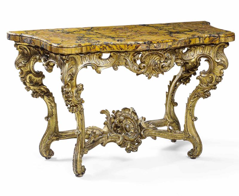 Ricchi decori a volute e motivi fogliacei, fascia traforata, gambe mosse riunite da crociera centrata da stemma a specchio. Piano sagomato in marmo giallo.