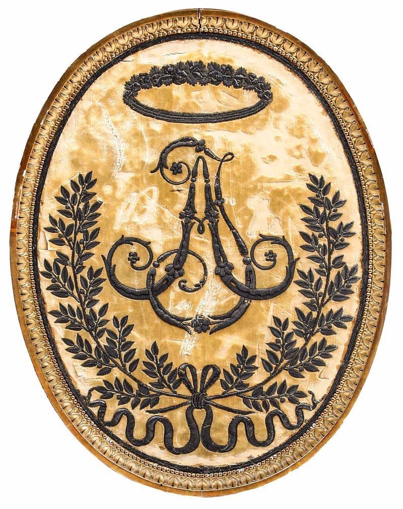 centrato da ovale in tessuto ricamato sul fronte con figura di bambina entro paesaggio e con monogramma sul retro (A I coronato, ricamato in filo d'argento)