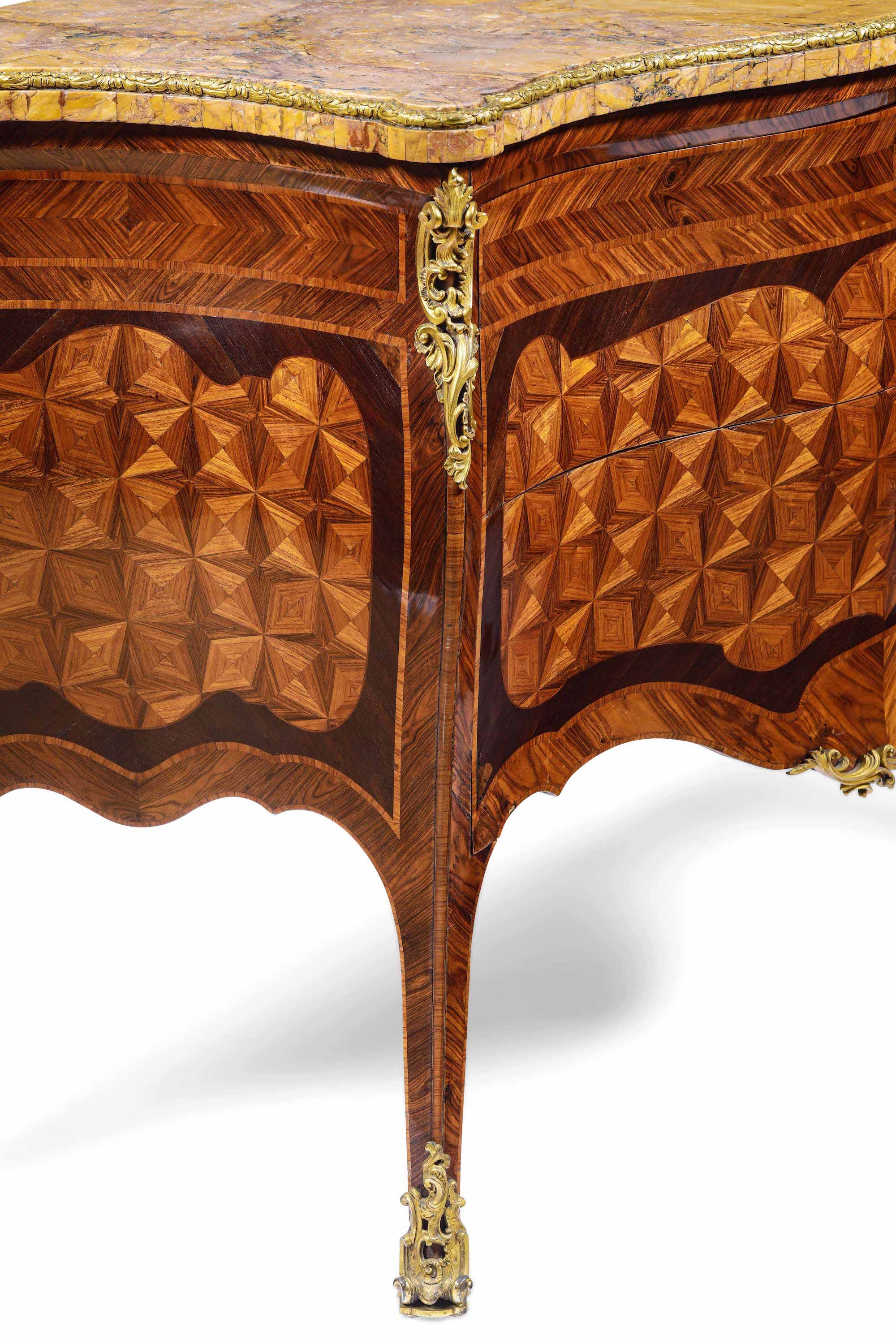 fronte e fianchi mossi, piano sagomato in marmo, applicazioni in bronzo cesellato e dorato
