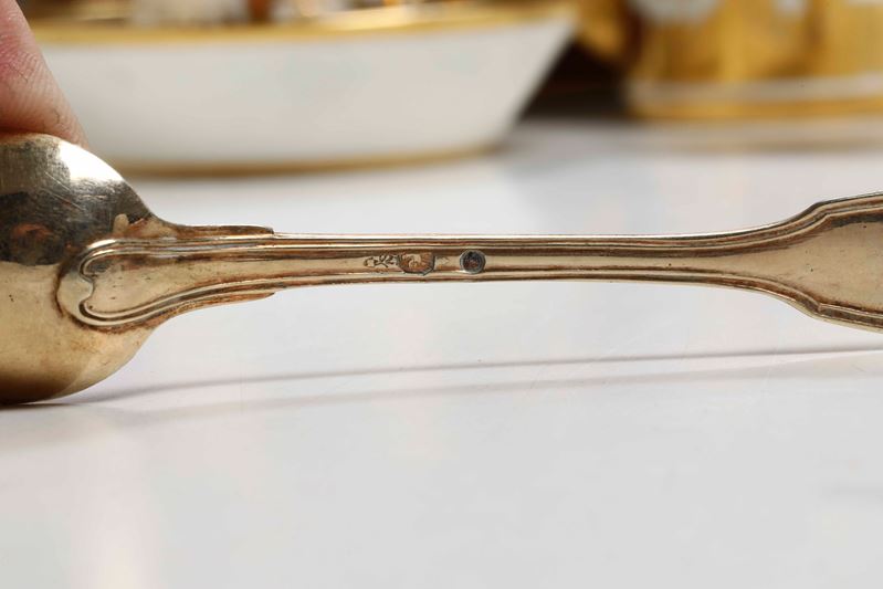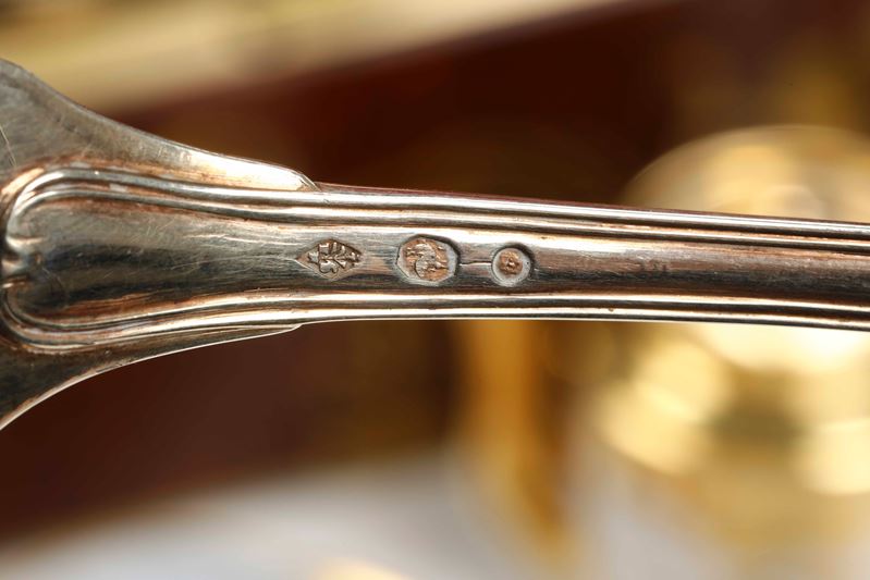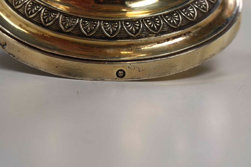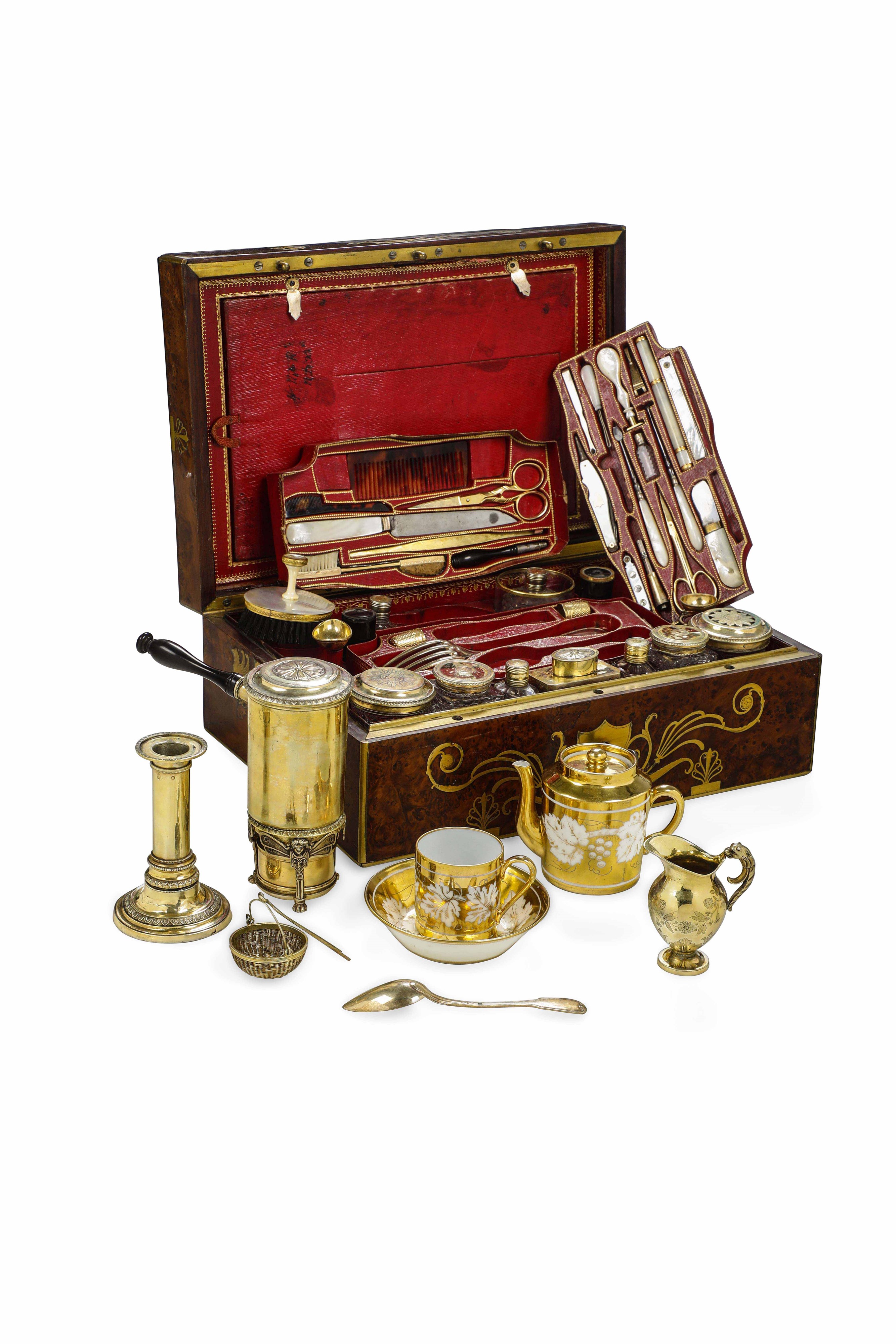 custodia in radica e bronzi dorati; accessori in argento primo titolo vermeille, marchio dell'argentiere consunto di difficile lettura (Francois-Dominique Naudin?)