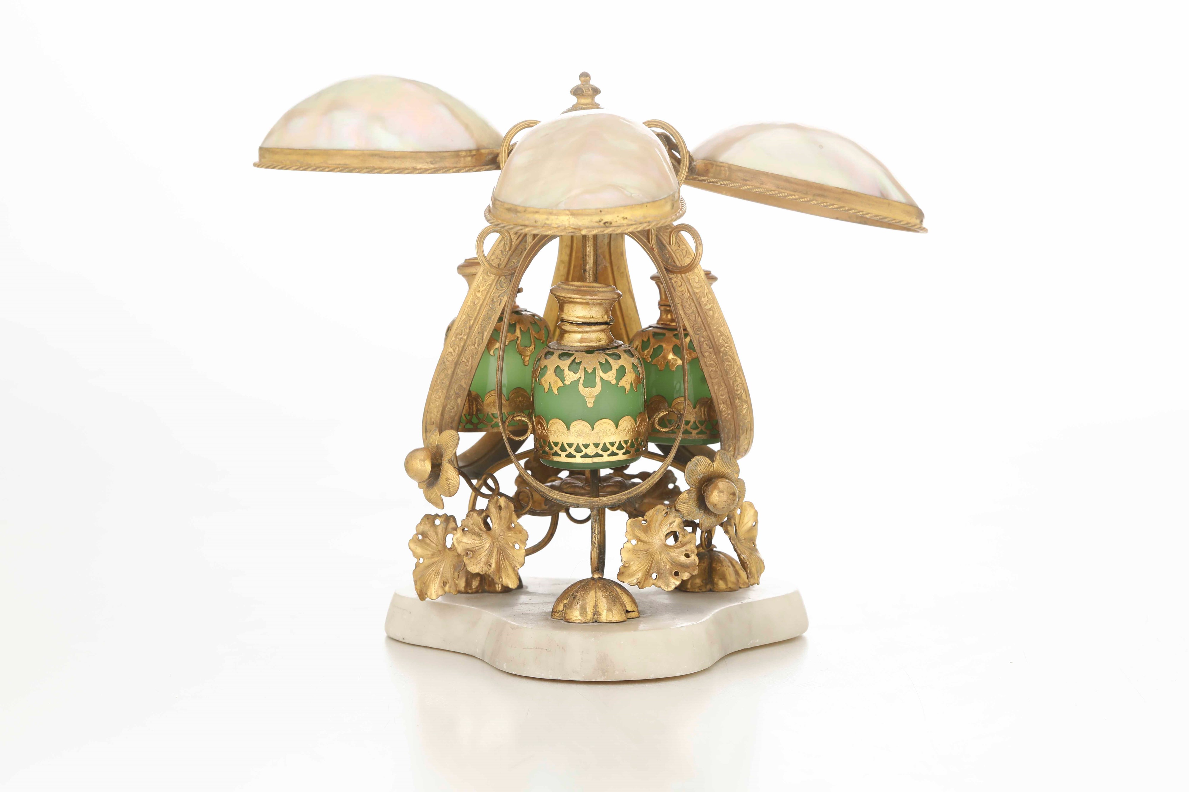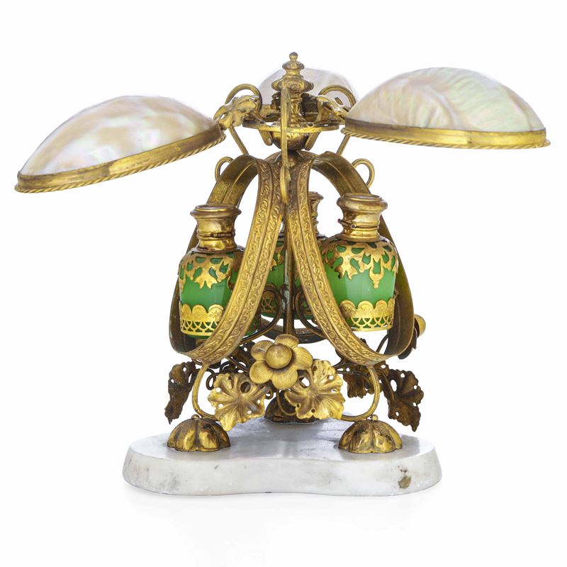 Portaessenze. Bronzo fuso, dorato, madreperla e vetro. Francia XIX secolo