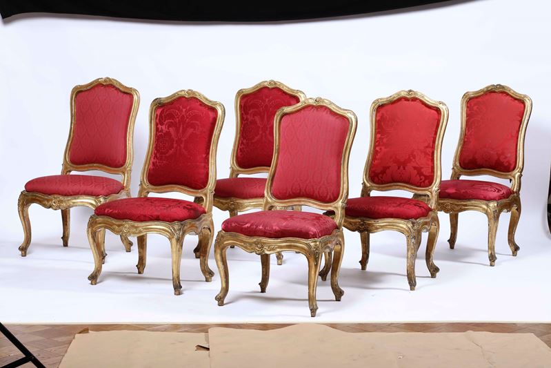 Salotto in legno intagliato e dorato composto da divano e sei sedie, Genova XVIII secolo