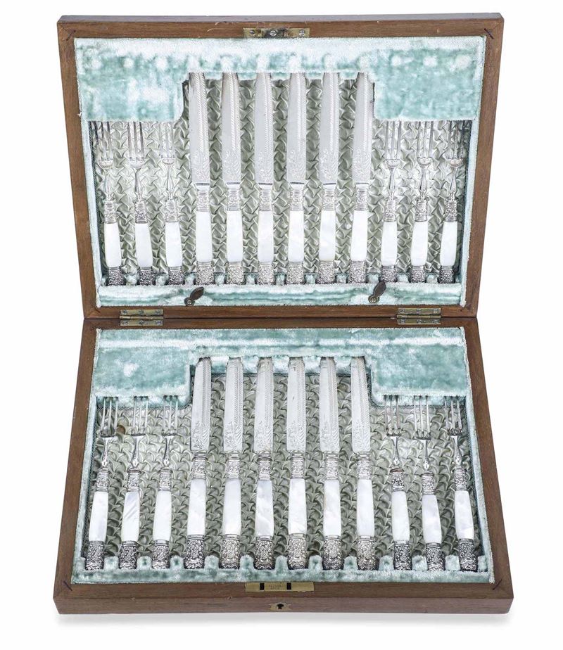 Servizio di posate. Metallo argentato e madreperla. Inghilterra XIX-XX secolo