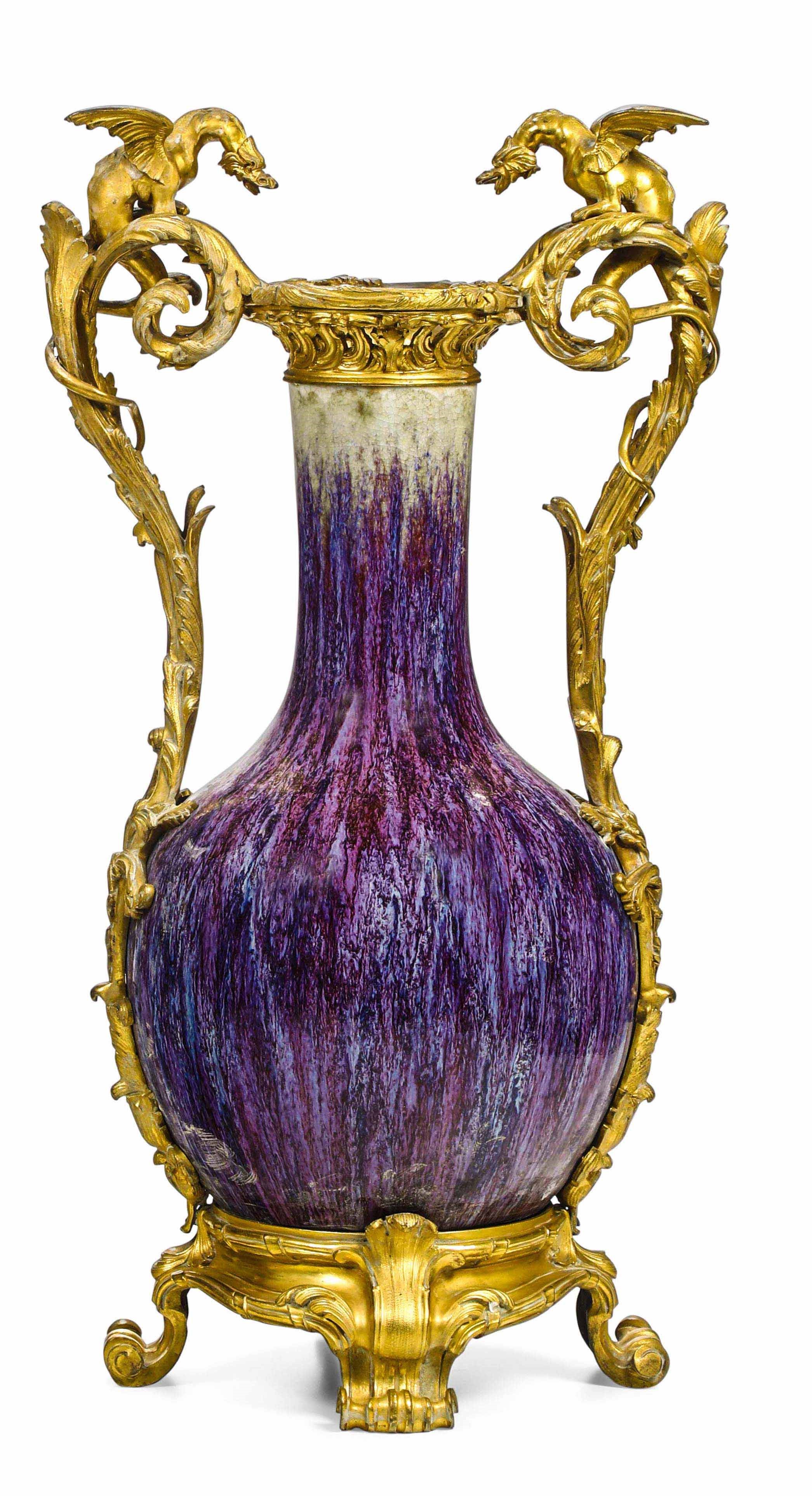 Vaso a bottiglia in porcellana flambè sui toni del viola e dell'azzurro, Cina, Dinastia Qing, epoca Qianlong (1736-1796)