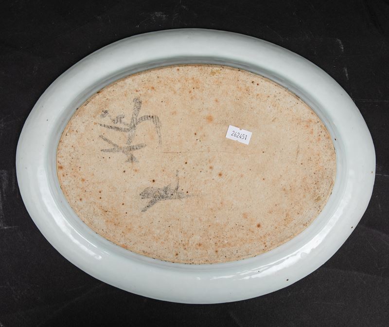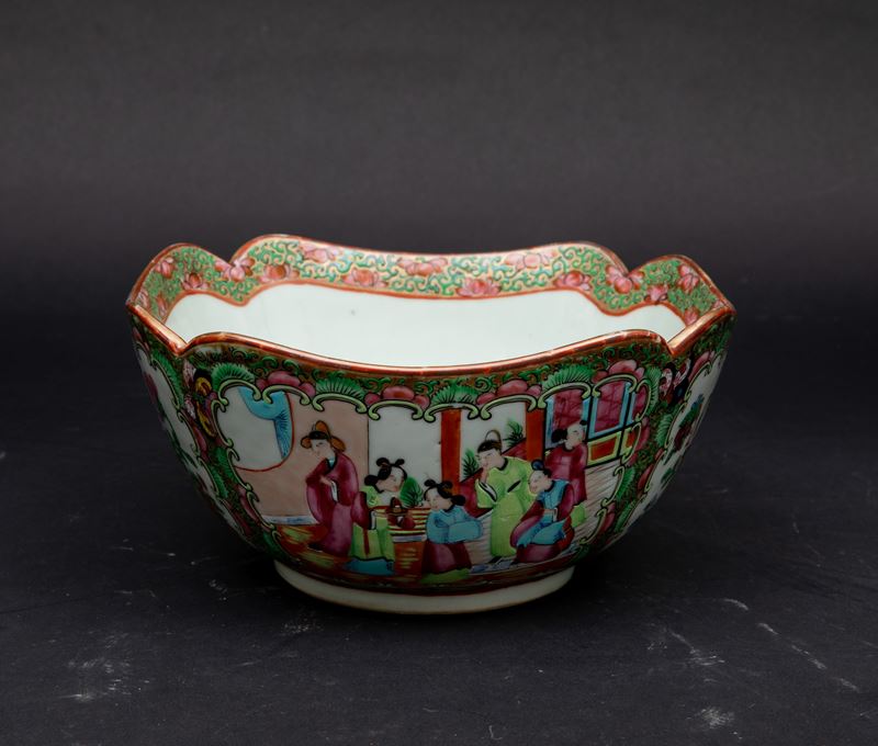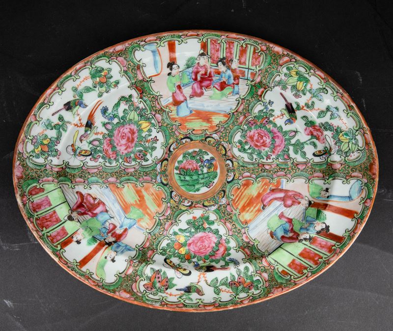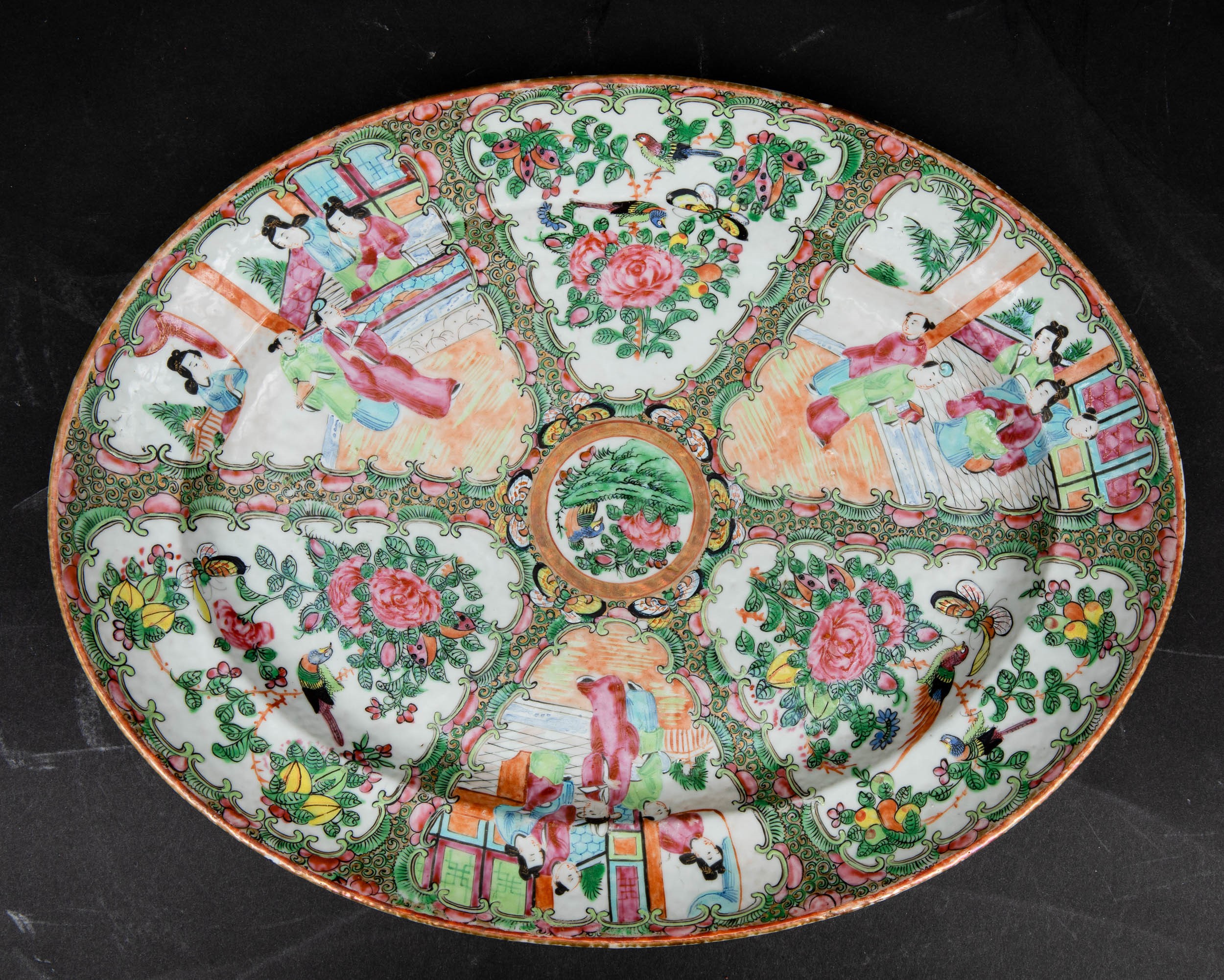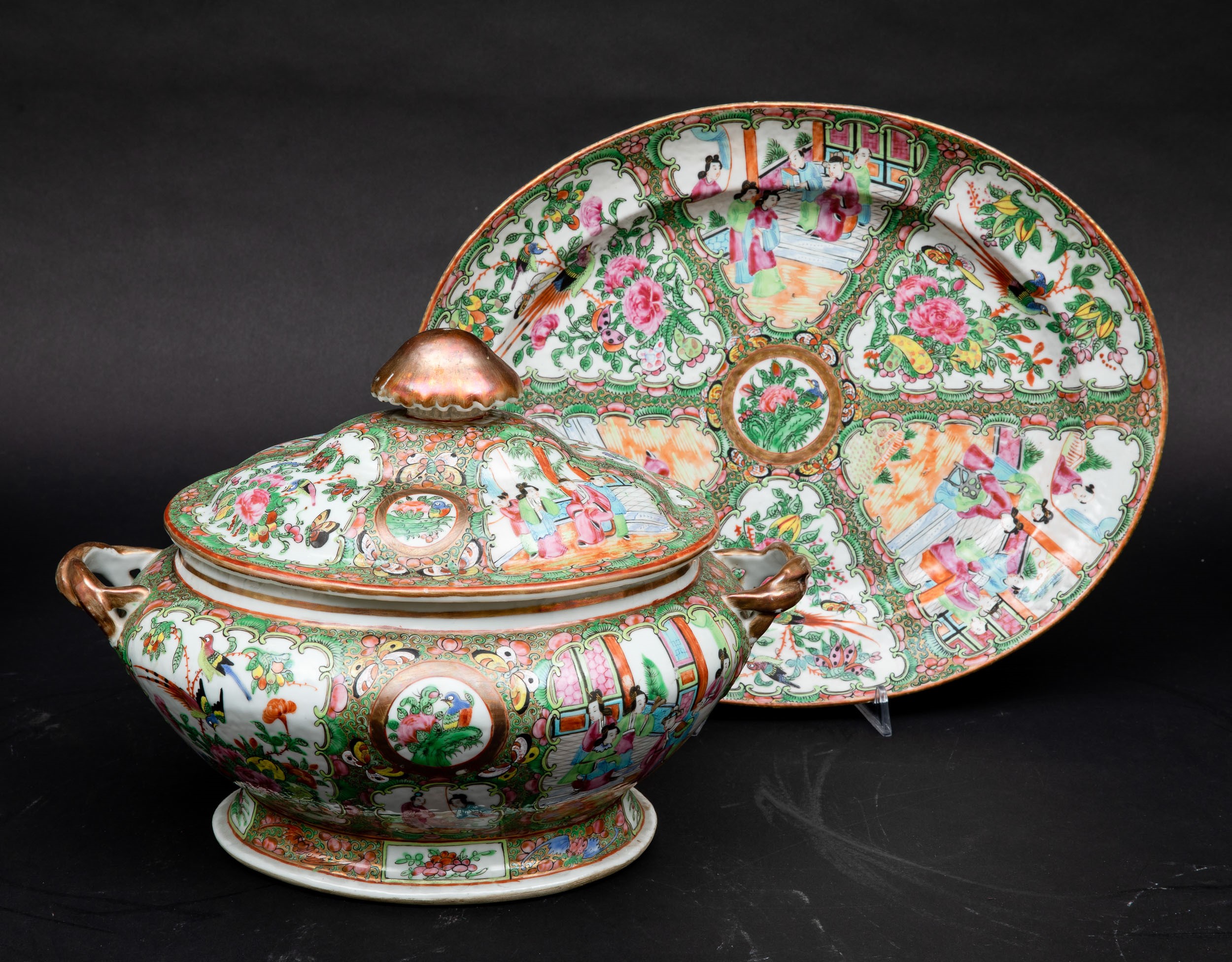 1800s (Canton). 6 dinner plates, 6 soup plates, 6 dessert plates, 4 large trays, 1 small tray, 2 lidded bowls, 1 bowl, 1 soup tureen and 1 stand