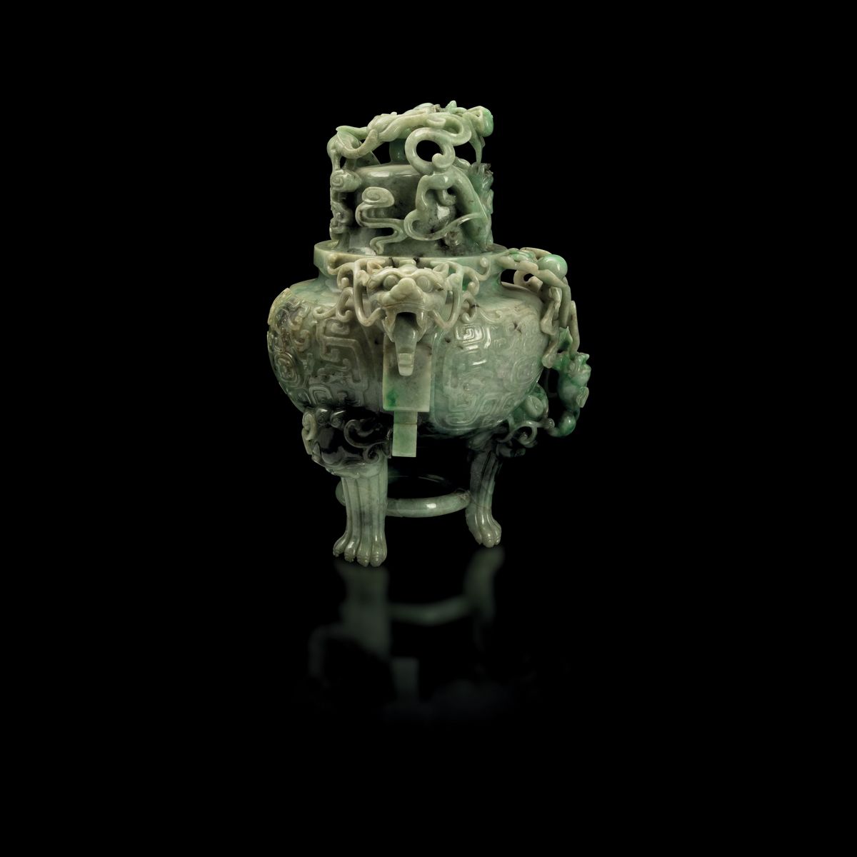 Vaso con coperchio scolpito in giadeite con sfumature green apple, mascheroni, figure di draghetti a rilievo e decori incisi, Cina, Dinastia Qing, XIX secolo