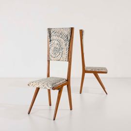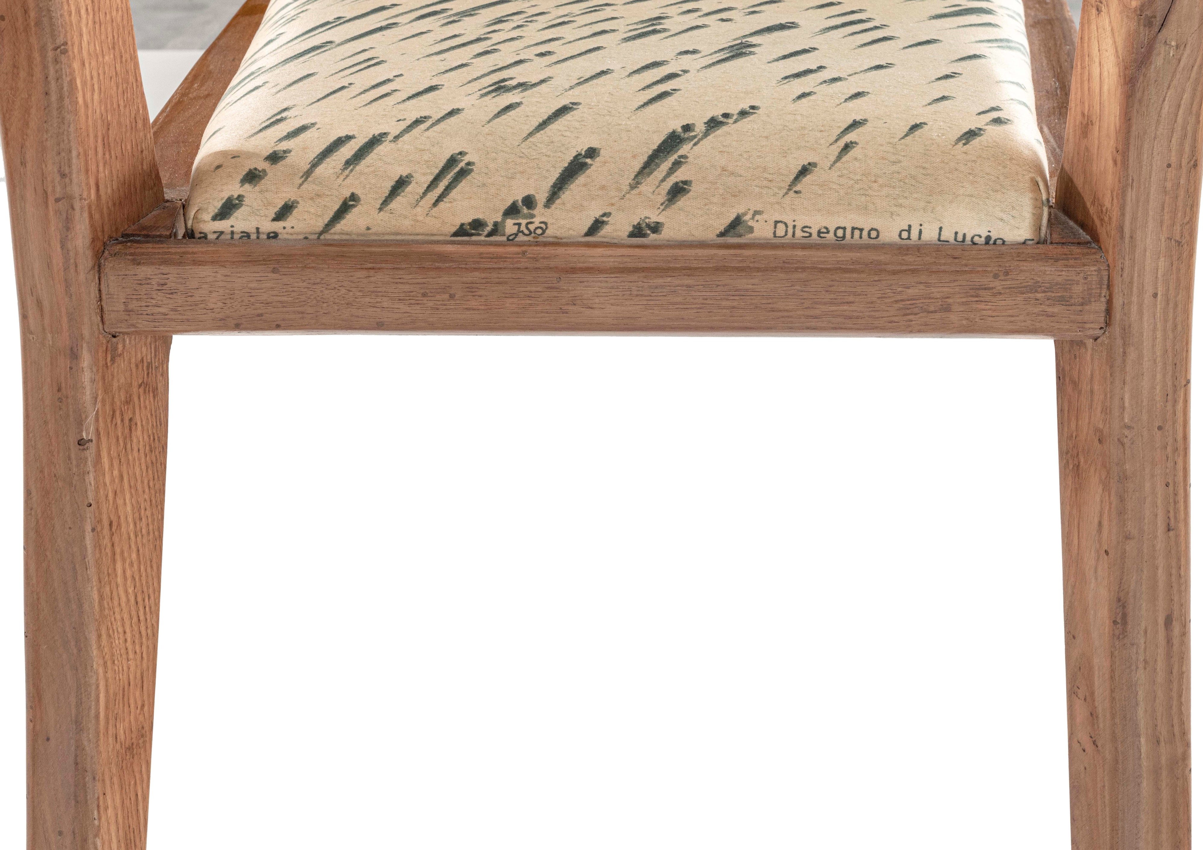 Struttura e sostegni in legno. Rivestimenti delle sedie in tessuto su Disegno di Lucio Fontana.