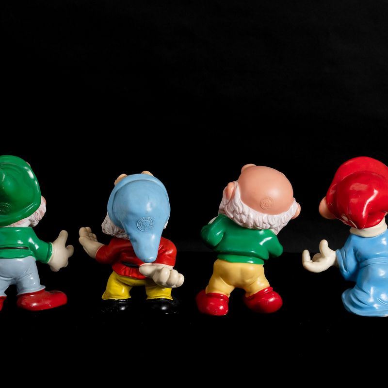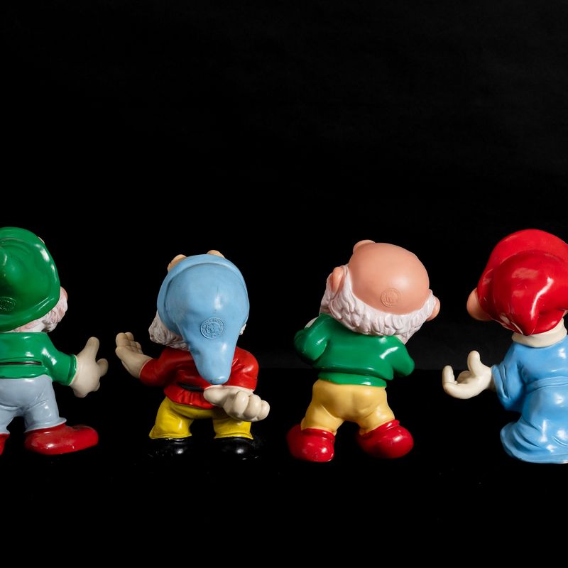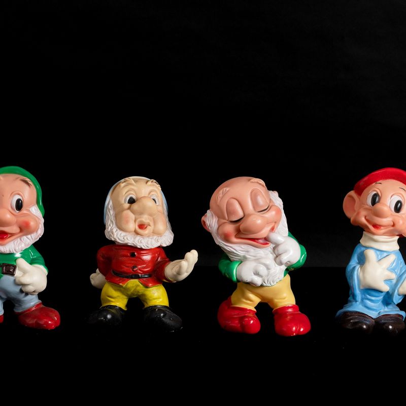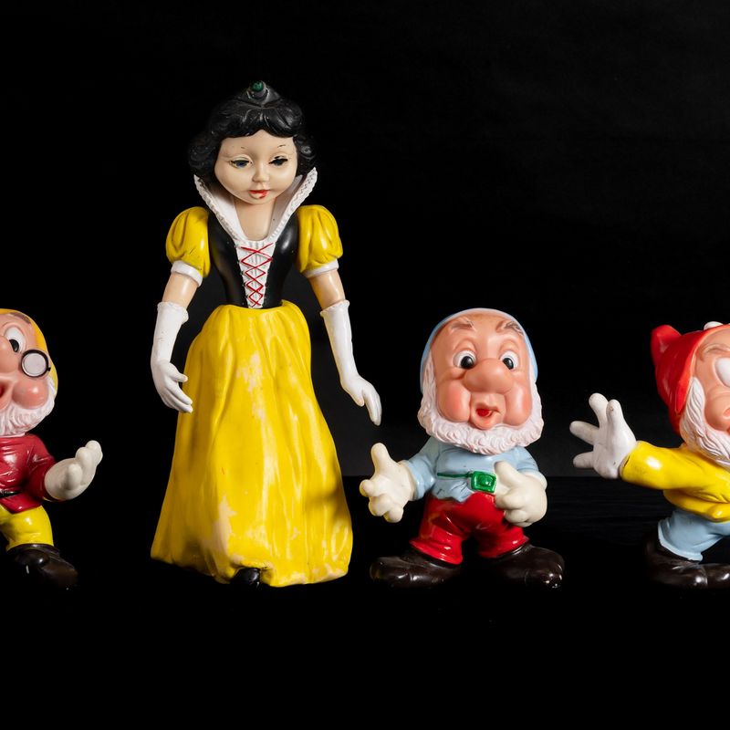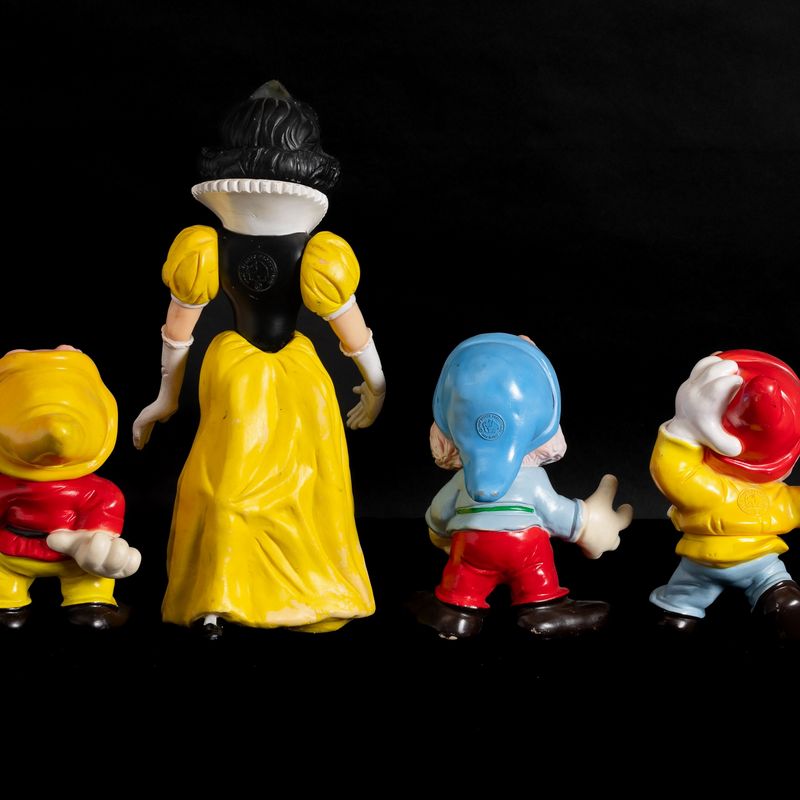 Pupazzi in gomma, marchiati Ledra, 1970 ca. Cm h 23 i Sette Nani e cm h 40 Biancaneve.