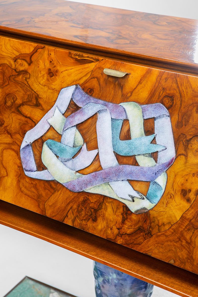Struttura in legno e radica ferrarese con decoro in rame smaltato. Maniglia in ottone. Base in marmo e ottone. Fusto in ottone e rame smaltato. Interni in vetro.