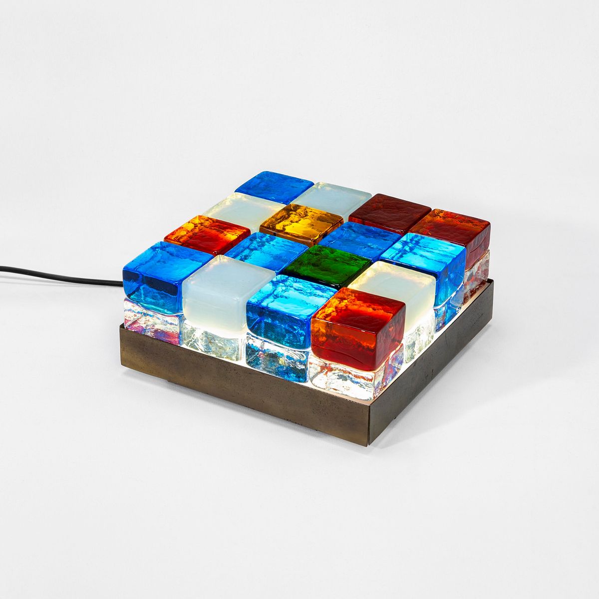 Struttura in ottone ed elementi diffusori mobili in vetro di Murano.