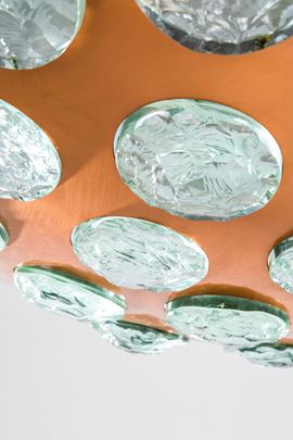Struttura in metallo laccato e rame con incastonati cristalli di forte spessore molati e scalpellati.
