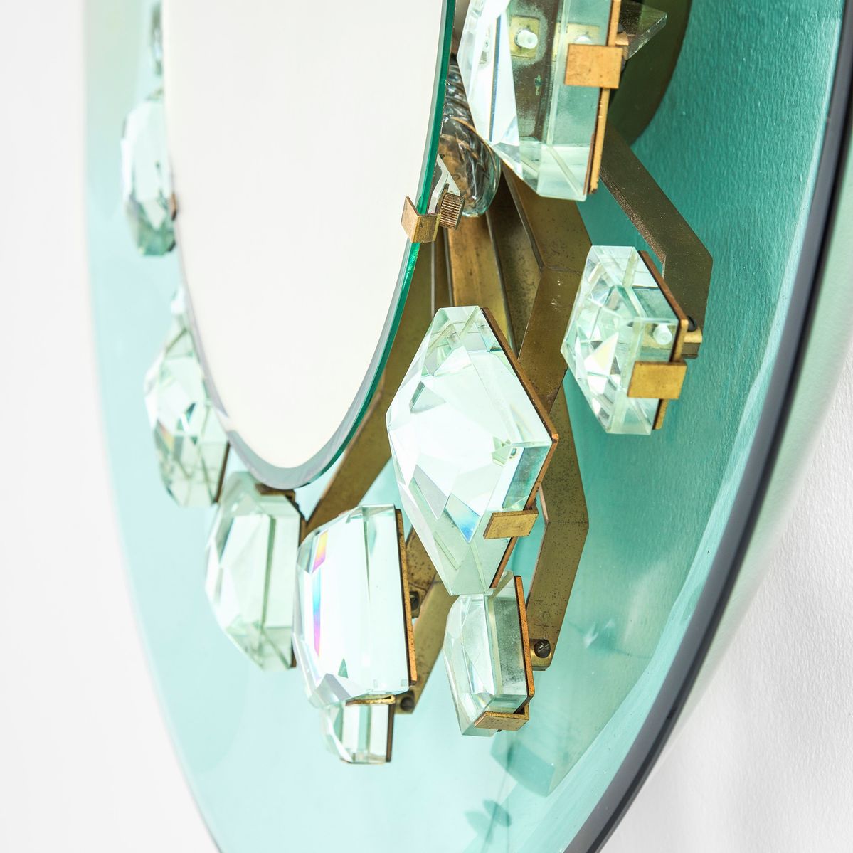 Struttura in vetro e ottone. Cornice in cristallo colorato curvato molato ed elementi a diamante in cristallo colorato specchiato molato di forte spessore.