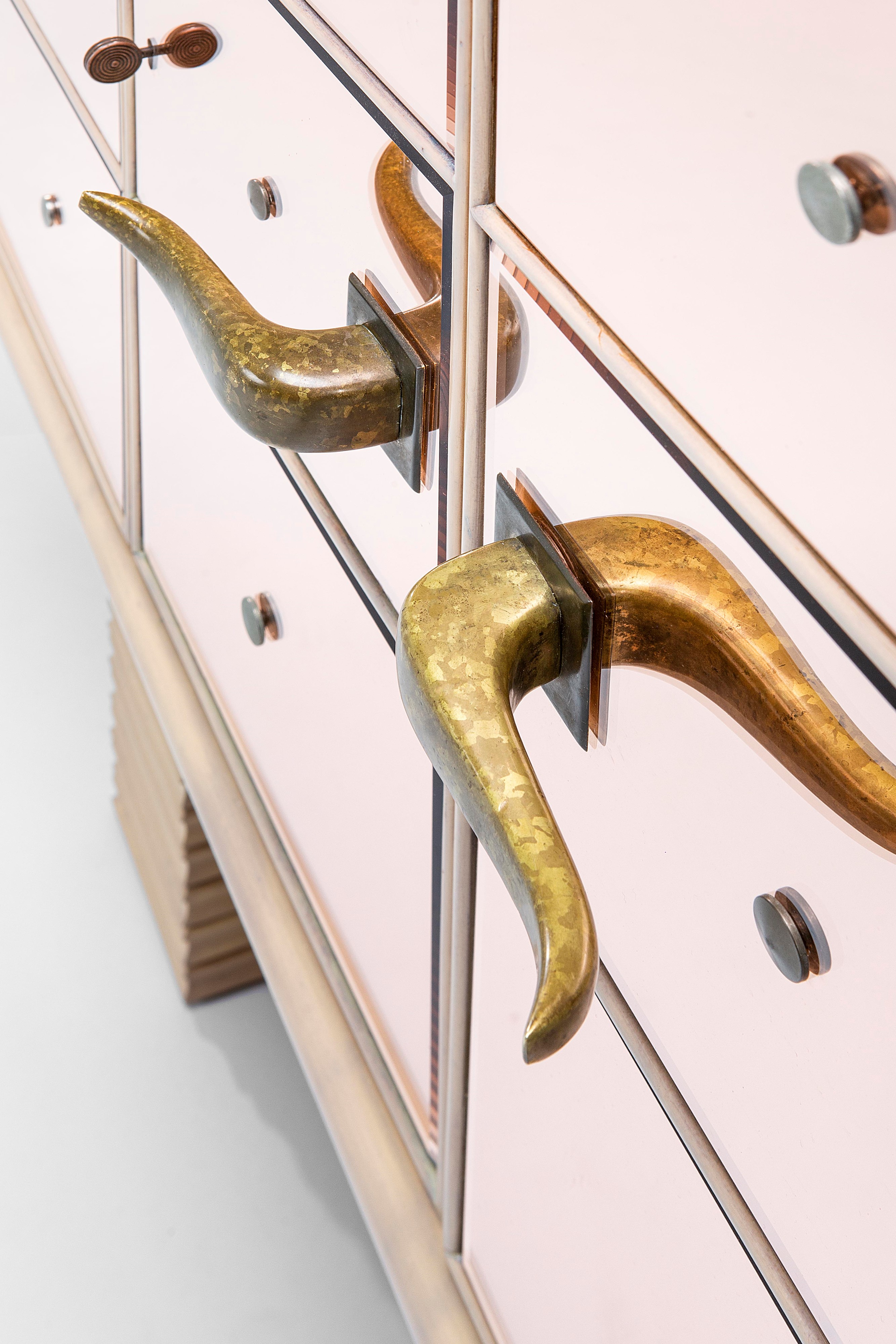 Struttura in legno e legno a ondulato con ante rivestite in vetro colorato specchiato con apertura a fisarmonica. Maniglie e decori in ottone. Interni in legno con rivestimenti in vetro.