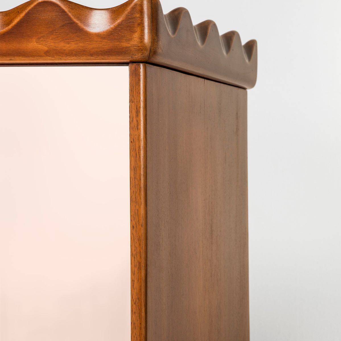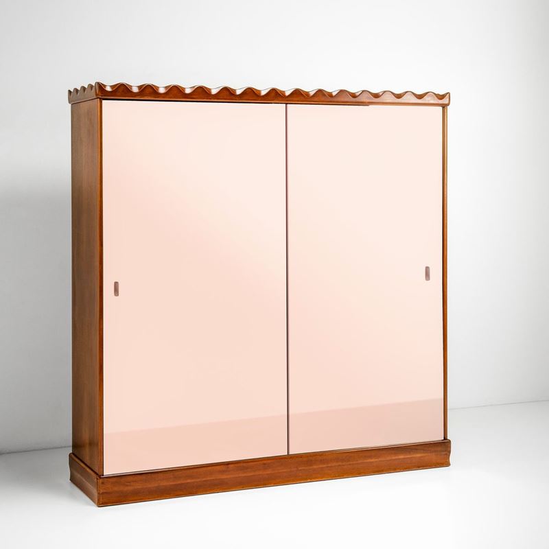 Struttura in legno e legno sagomato. Ante in vetro specchiato colorato.