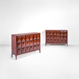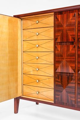 Struttura in legno con ante in legno a diamante. Piano in vetro colorato.