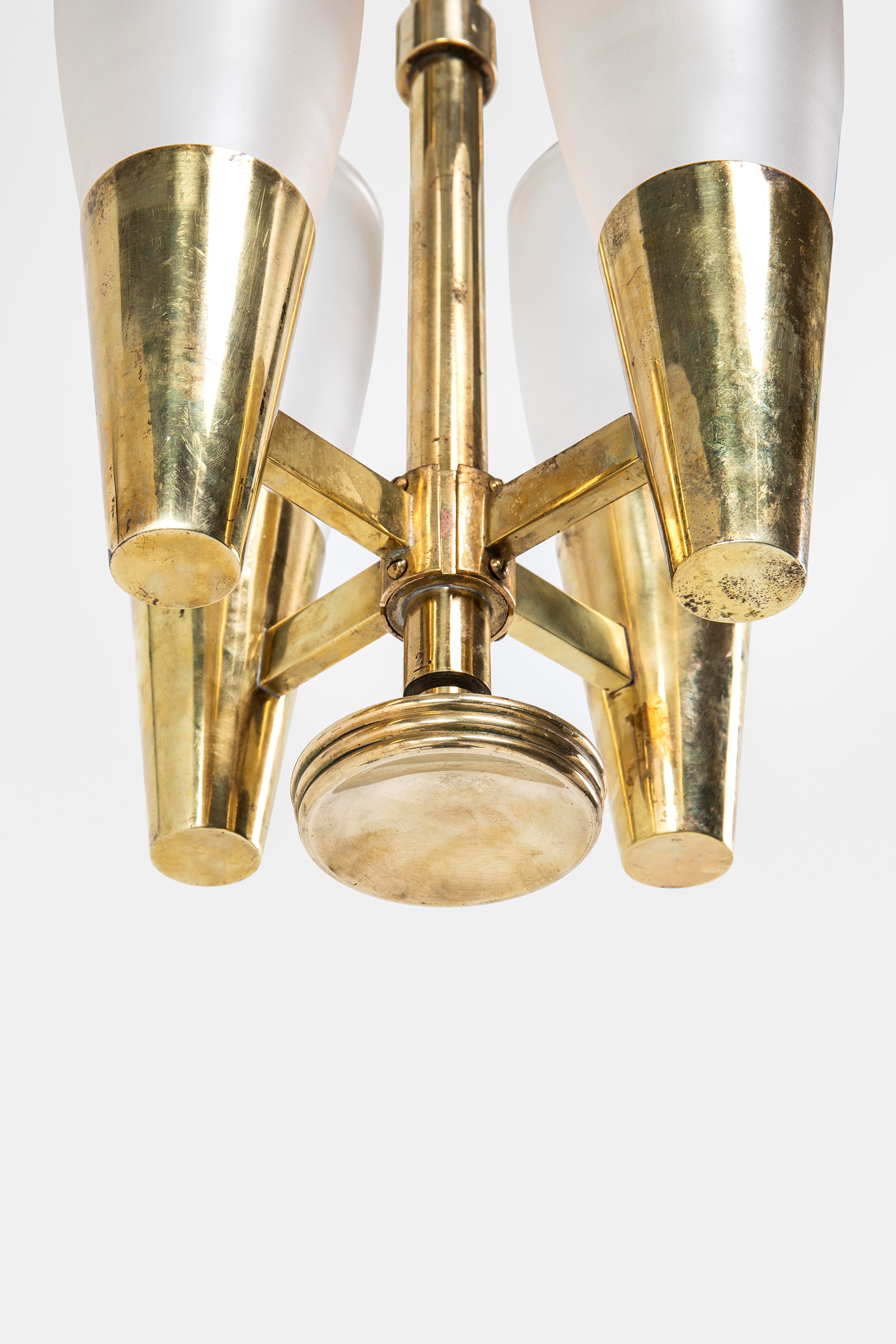 Struttura in ottone e diffusori in vetro satinato.