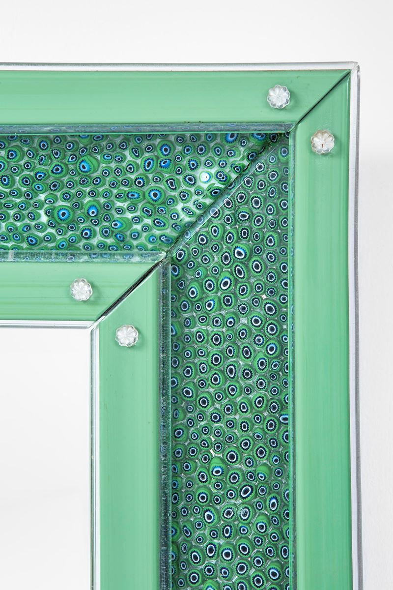 Cornice in vetro opalino e in vetro con decoro a Murrine verde antico. Struttura in legno.