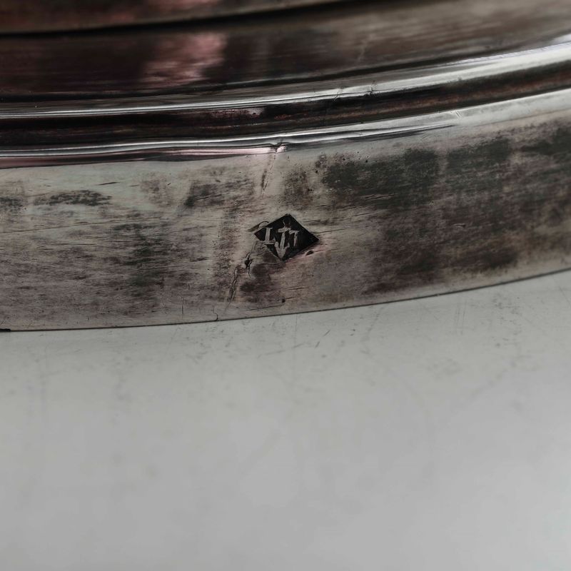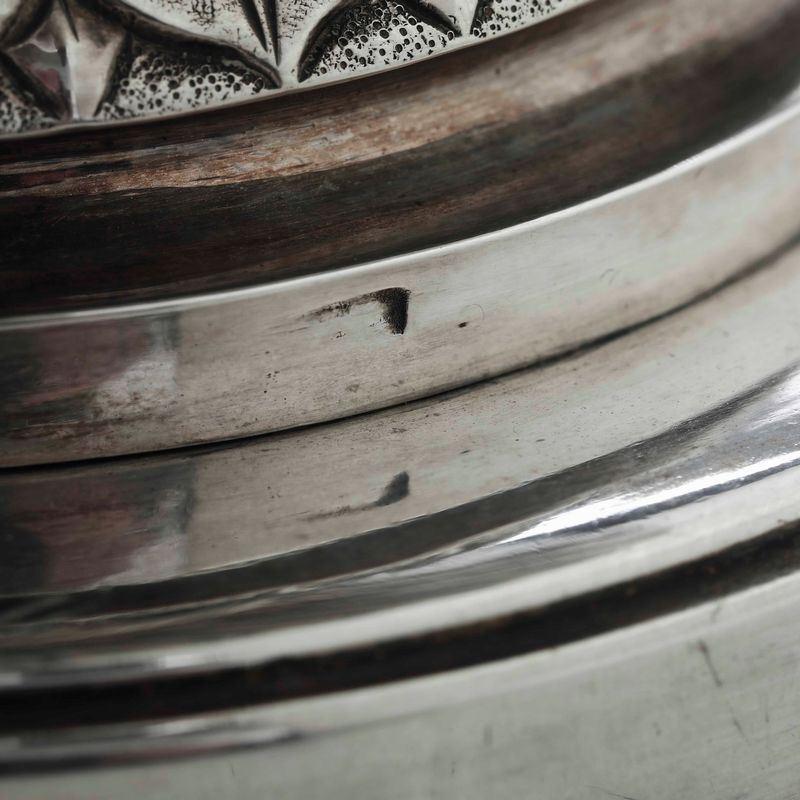 Silversmith's mark LT with an arrow within a losange (Luigi Tomati?). Molten, embossed and chiselled silver. Carved and ebonised wooden handle (The base has been restored and modified)