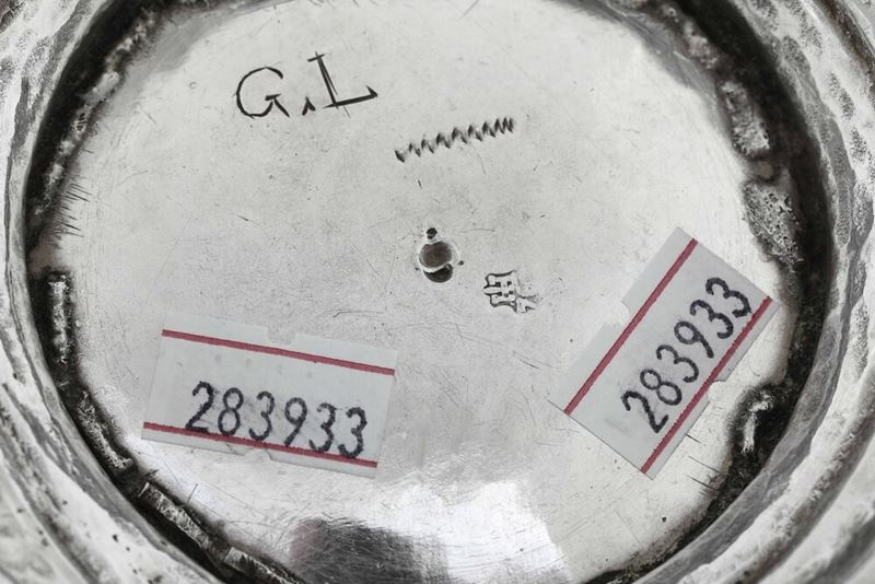 Monogram engraved on the bottom: GL. Molten, embossed and chiselled silver, carved wooden handle