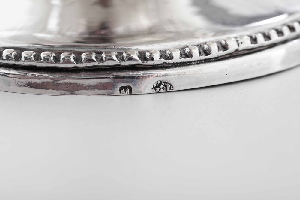 Molten and embossed silver, carved wooden handle