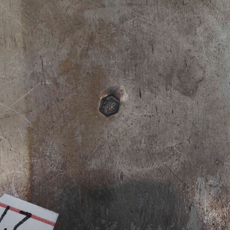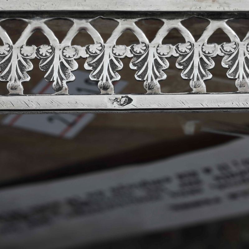 (Unreadable maker's mark). Molten, embossed, perforated and chiselled sterling silver with glass cruets.