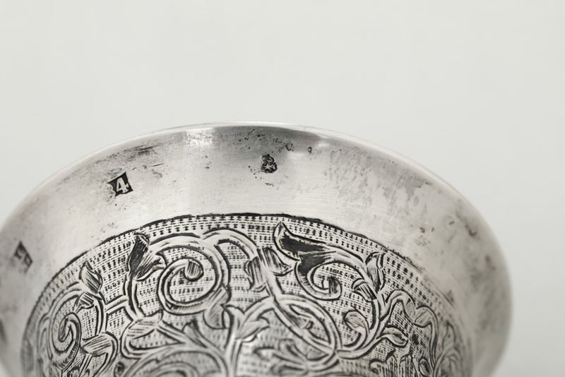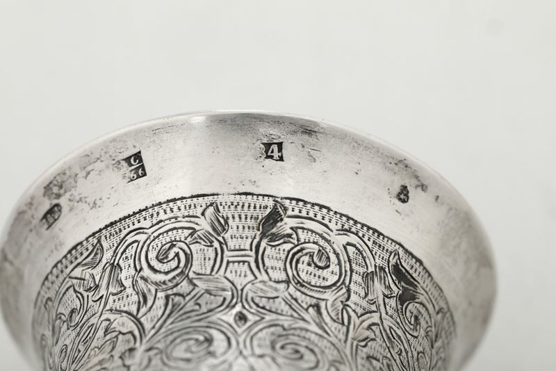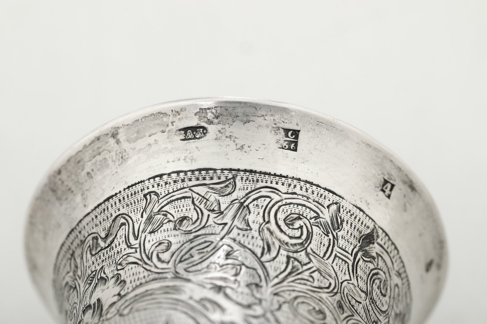 Partly readable assayer's mark (Viktor Savinkov?) and unidentified silversmith's mark. Molten, embossed and chiselled silver