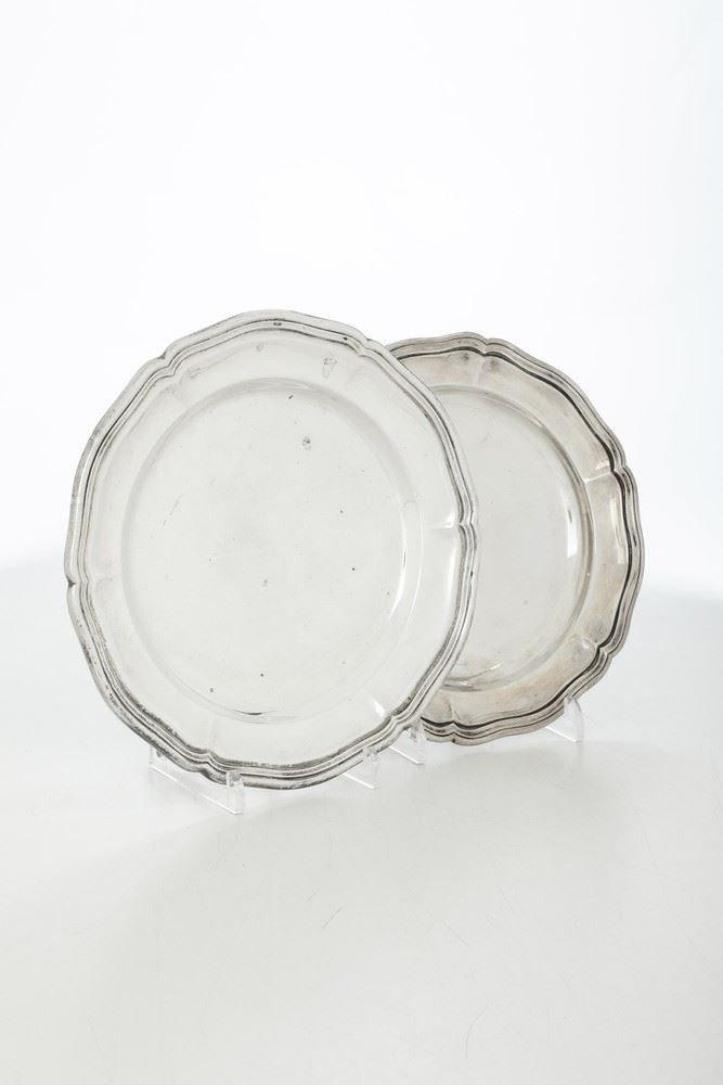 The lot includes two similar silver plates, Italy, 18/1900s (diam. 20.5 and 21.5cm)