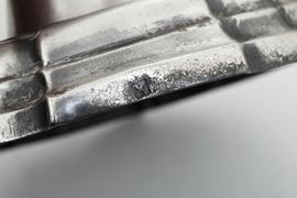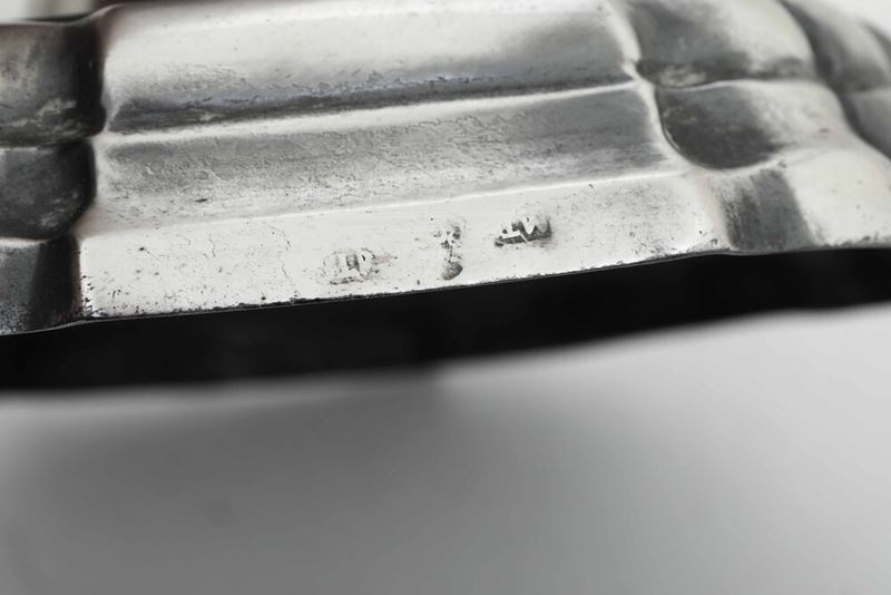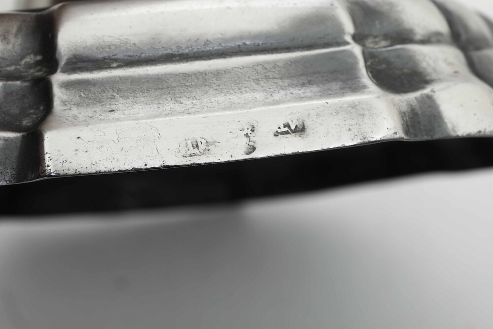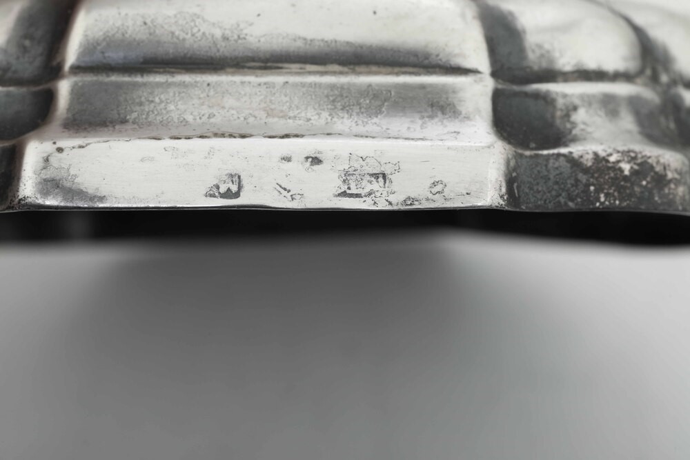 Silversmith's mark MT within a rectangle and unreadable cameral mark. Molten, embossed and chiselled silver