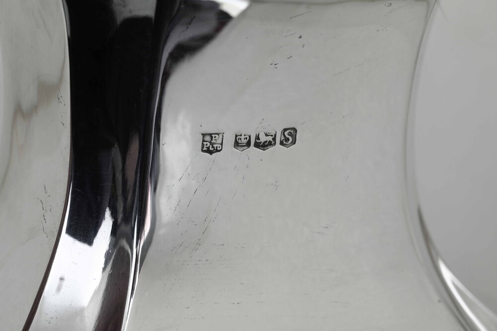 Marks for the city of Sheffield 1935 and silversmith PP Ltd within a shield (unidentified). Molten and embossed silver